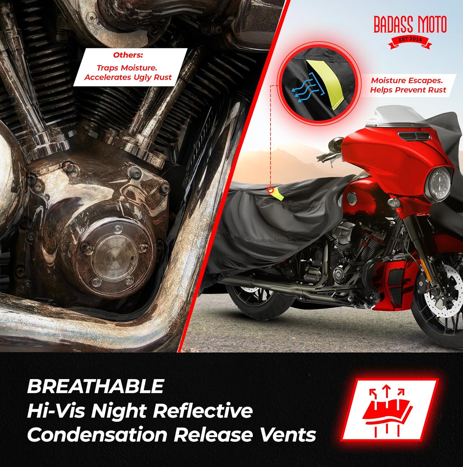 Badass Moto Ultimate Motorcycle Cover Waterproof Outdoor Heavy Duty Durable All Season Storage Harsh Weather Sun Rain Cover fits Harley Davidson Street Glide, Vulcan, Shadow, Cruiser Bikes. Large 97L