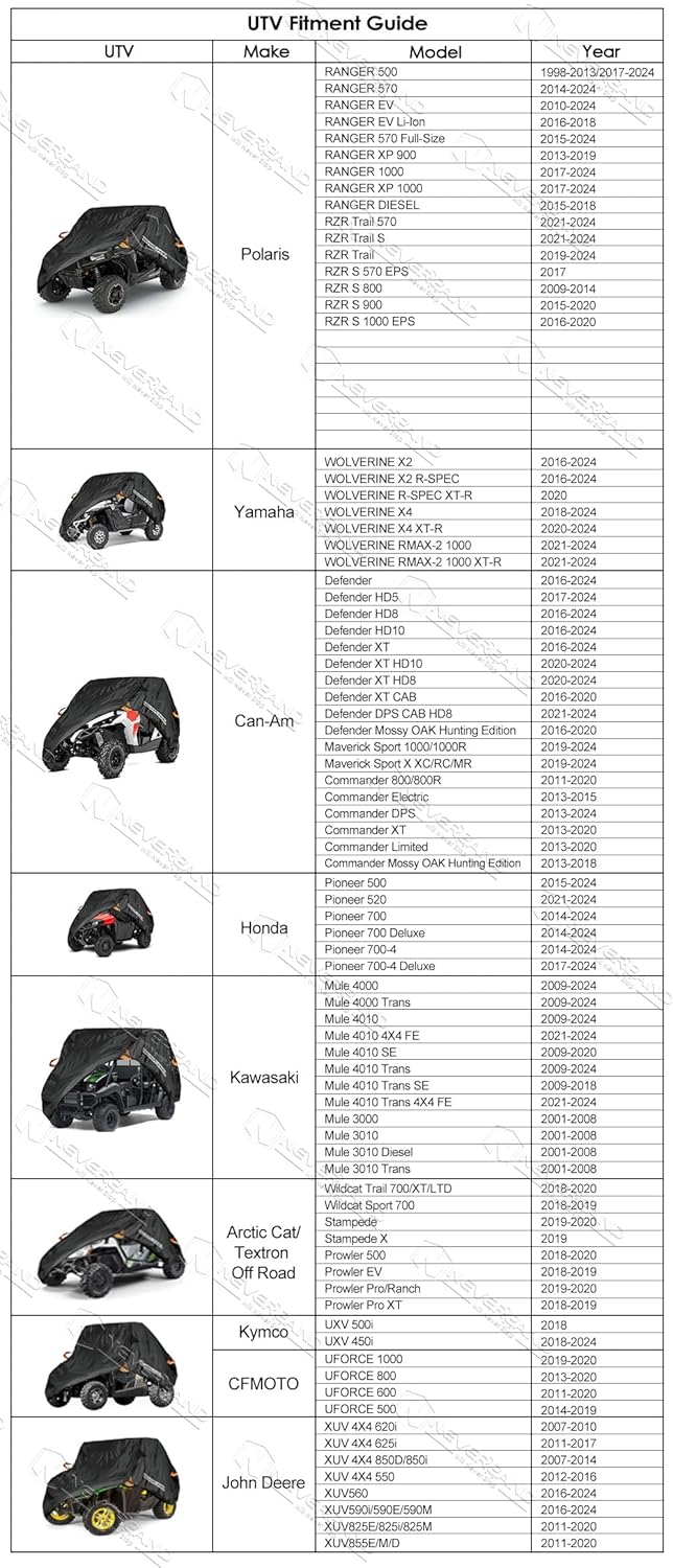 - [Fits Most 2-3 Seats]: You can refer to the compatibility table given on the chart, our covers are compatible with polaris, rzr, yamaha, can-Am defender, kawasaki mule ranger etc. Up to 125" in length, please check UTV sizes carefully before purchasing