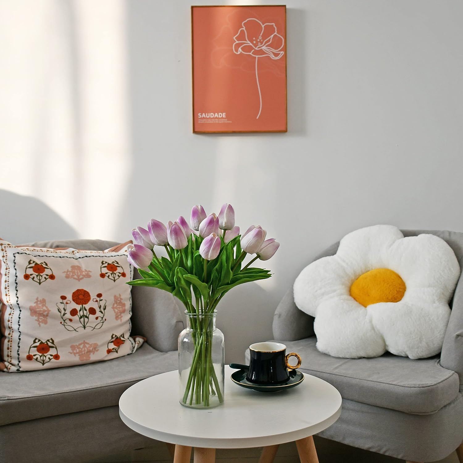 - All-Season Beauty with Gentle Color Care.These tulips bring timeless charm to Easter, Mother’s Day, weddings, or year-round décor. To preserve the soft tones of light-colored flowers—especially white—we recommend avoiding direct sunlight for long-term (6+ months) display, as PU petals may naturally yellow over time.