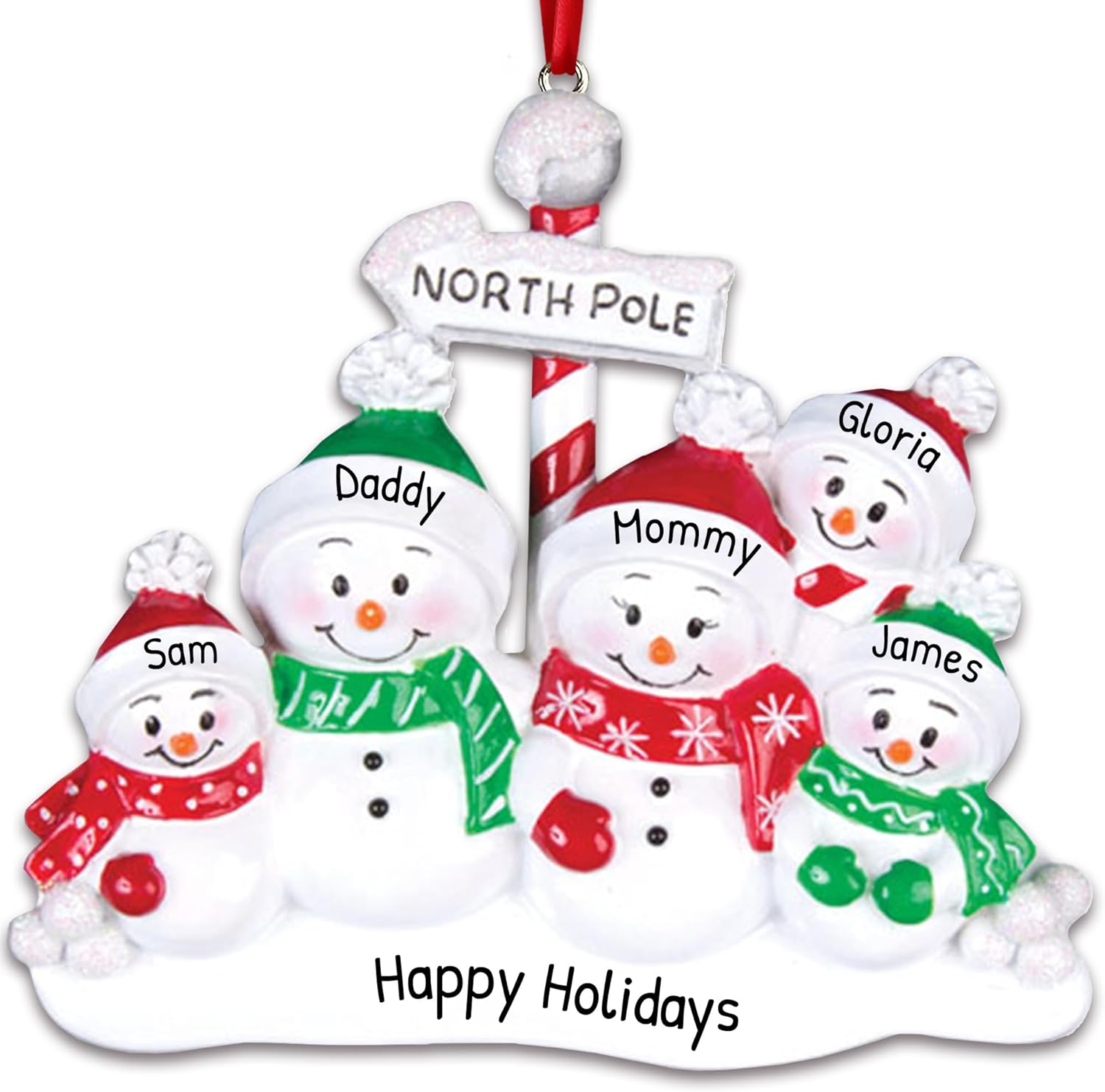 - 🎁 Celebrate Your Family of 5: Mark a joyful milestone with a personalized family of 5 Christmas ornament 2025. Whether it’s your first year as five or part of a cherished tradition, this keepsake honors your growing bond and tells your story with warmth, love, and festive cheer. This snowman family of five ornament features smiling snow faces and carrot noses, red and green winter accessories, and a North Pole sign with glitter top, bringing a cozy snow scene holiday theme to life.