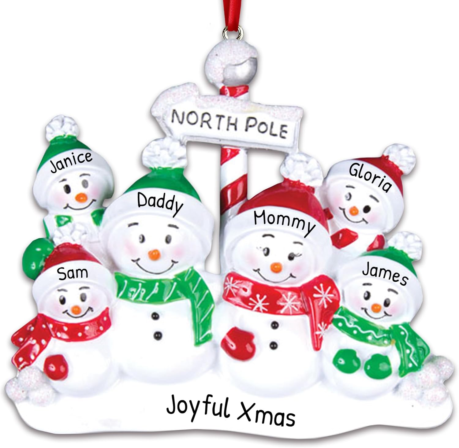 - đ Celebrate Your Family of 6: Mark a joyful milestone with a personalized family of 6 Christmas ornament 2025. Whether itâs your first year as six or part of a cherished tradition, this keepsake honors your growing bond and tells your story with warmth, love, and festive cheer. Celebrate winter magic with this cheerful Christmas decoration featuring a snowman family of six design all bundled in red and green winter accessories. They stand proudly beneath a North Pole sign ornament, bringing whimsical charm to your tree. With its snowy white holiday scene, this piece adds heartwarming joy to your seasonal dĂŠcor.