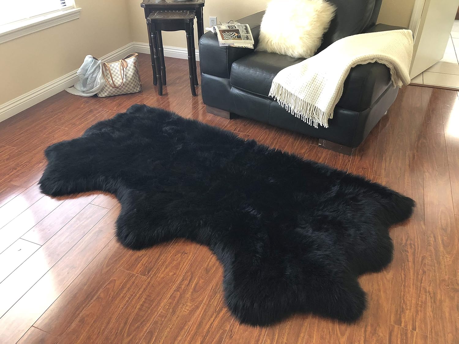 - MULTIPURPOSE DESIGN REAL SHEEPSKIN RUG: The sheepskin rugs are multipurpose and used as seat covers rug, couch pads, and area carpets. The stain-resistant, latex-free rug is designed for daily indoor use faux fur that is a super soft material rug under your feet. This free shape silky shag rug that works with a wide variety of decors great addition for kid’s room rug.