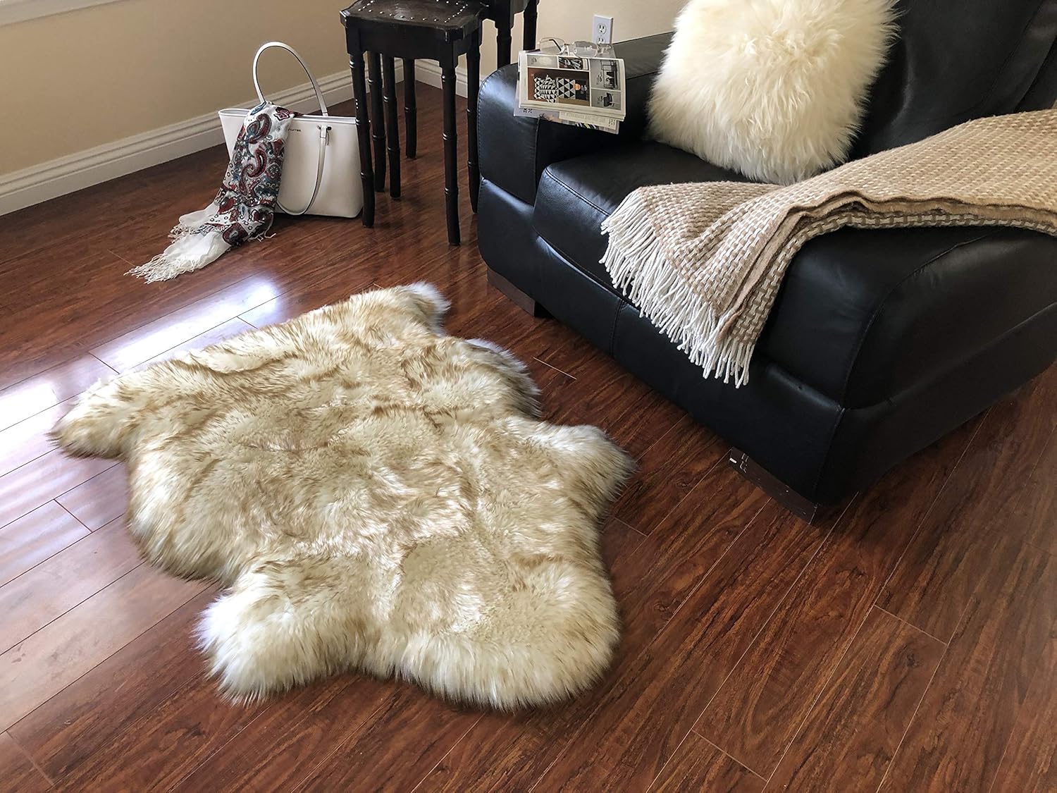 - MULTIPURPOSE DESIGN REAL SHEEPSKIN RUG: The sheepskin rugs are multipurpose and used as seat covers rug, couch pads, and area carpets. The stain-resistant, latex-free rug is designed for daily indoor use faux fur that is a super soft material rug under your feet. This free shape silky shag rug that works with a wide variety of decors great addition for kid’s room rug.