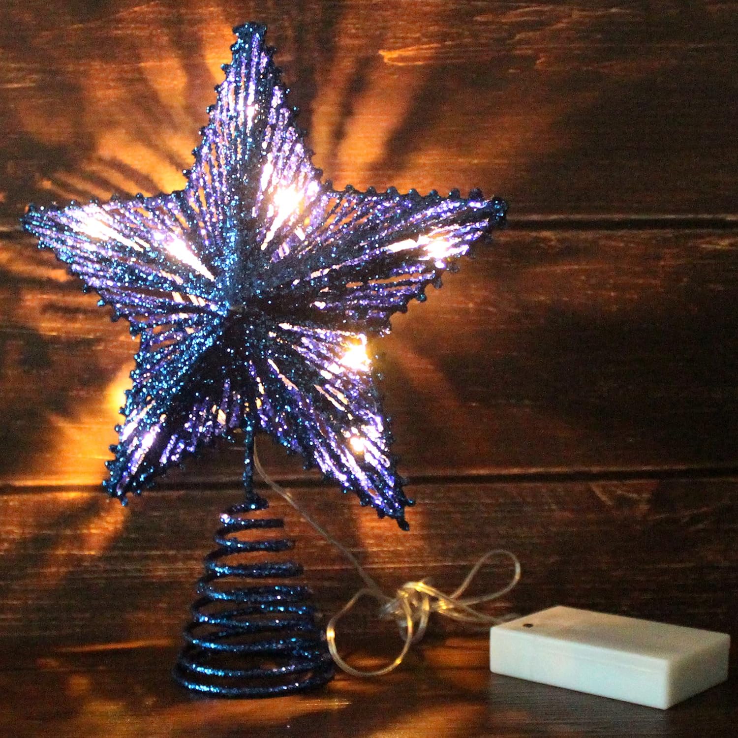CVHOMEDECO. Blue Glittered 3D Tree Top Star with Warm White LED Lights and Timer for Christmas Ornaments and Holiday Seasonal Décor, 8 x 10 Inch