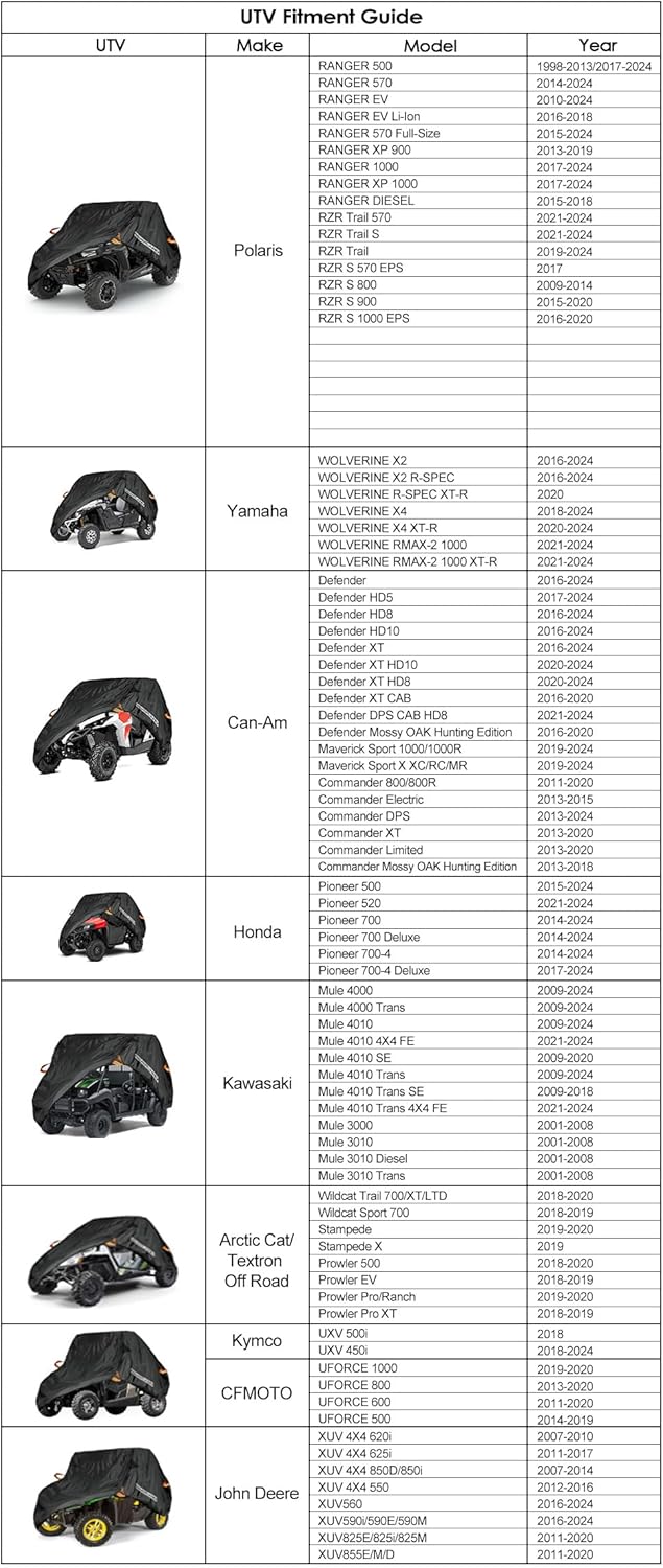 - Fitment Models :NEVERLAND UTV cover fits for Polaris RZR Yamaha Can-Am Defender Honda Pioneer Teryx Mule / Single Row Seats UTV (2-3 Passenger), ★Please note : only for Single Row Seat! Please check your UTV MODEL YEARS as well as the UTV Fitment Guide before you making an order! If you still have doubts , please feel free to ask us