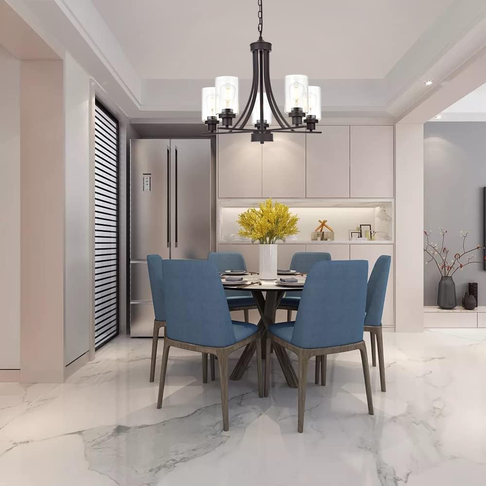 - 🌙 5 Light Glass Chandelier: This contemporary chandelier with high clear glass shades,it is an elegant update for traditional and modern homes alike.It's the perfect light fixture to install in kitchen, island, dining room,living room,foyers ,hallway,bedroom,coffee bar, lobby, restaurant and any space you like.