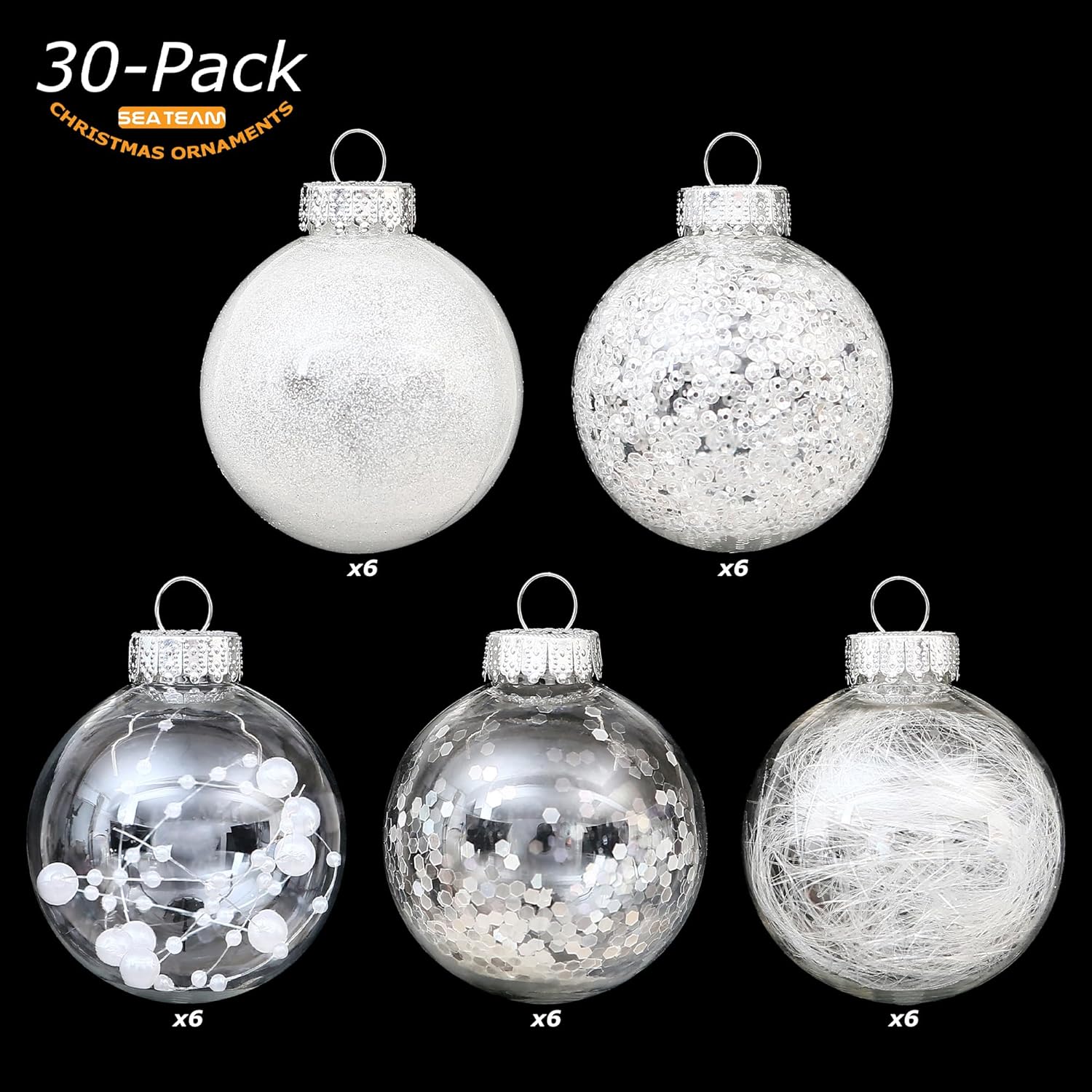 Sea Team Shatterproof Clear Plastic Christmas Ball Ornaments Decorative Xmas Balls Baubles Set with Stuffed Delicate Decorations (60mm/2.36 inch 30-Pack, White)