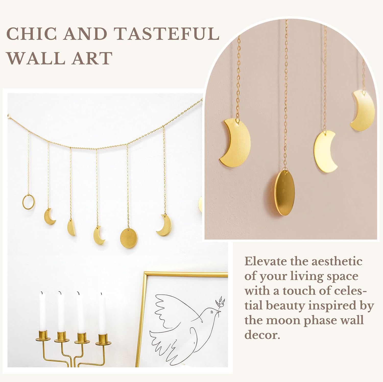 Mkono Moon Phase Wall Hanging Boho Aesthetic Room Decor Metal Moons Garland Hanging Art Bohemian Home Decoration for Girls Room Nursery Bedroom Livingroom Dorm, Ideal, Gold, 50"