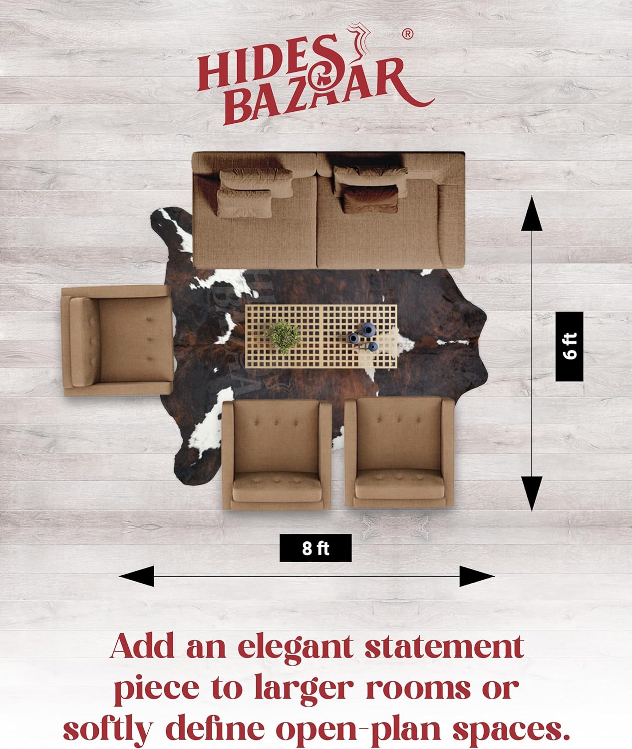 Natural Cowhide Rug for Home & Office Premium Dark Tricolor Cowhide Rug with Unique Dark Brown, Black & White Patterns- Cow Hide Rugs Made with Tanned Leather - Cow Hide Rugs 6x7-8 ft