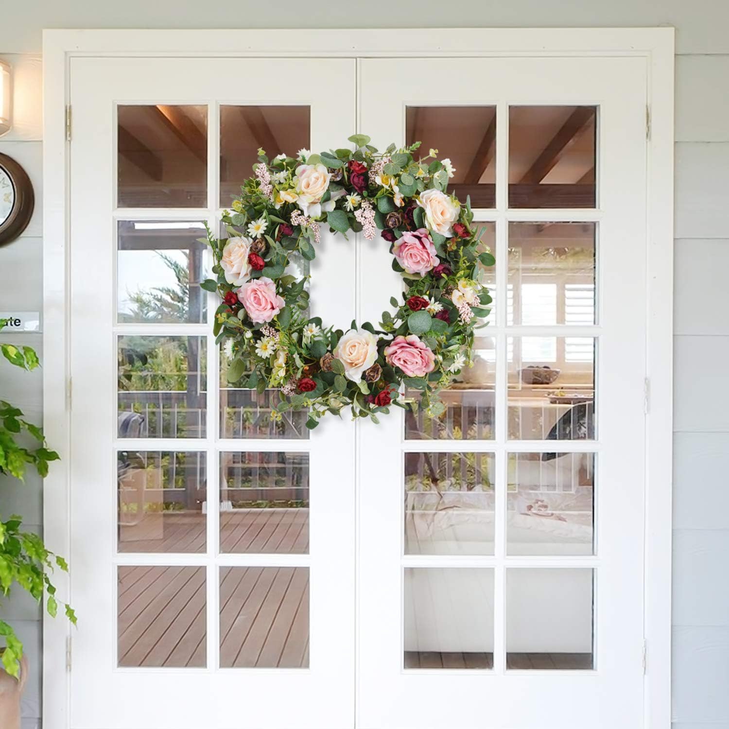 WANNA-CUL 24 Inch Large Spring Rose Wreaths for Front Door,Spring Front Door Wreath with Pink and Wine Red Floral Door Wreath with Eucalyptus Leaves for Wedding or Indoor&Outdoor Decorations