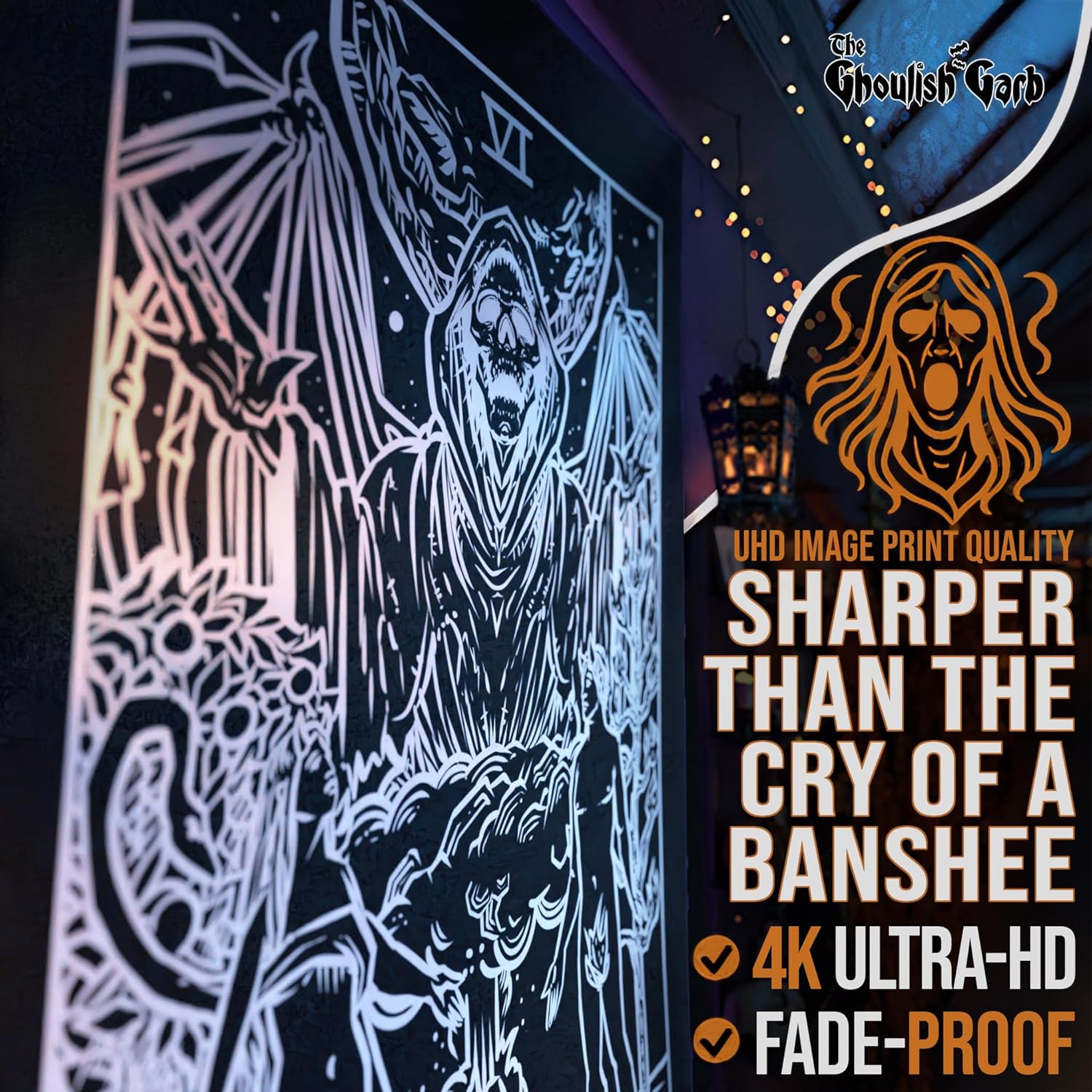 - 💀 Features a Monochromatic, Ghoulish Rendition of the Major Arcana Tarot Card, The Lovers