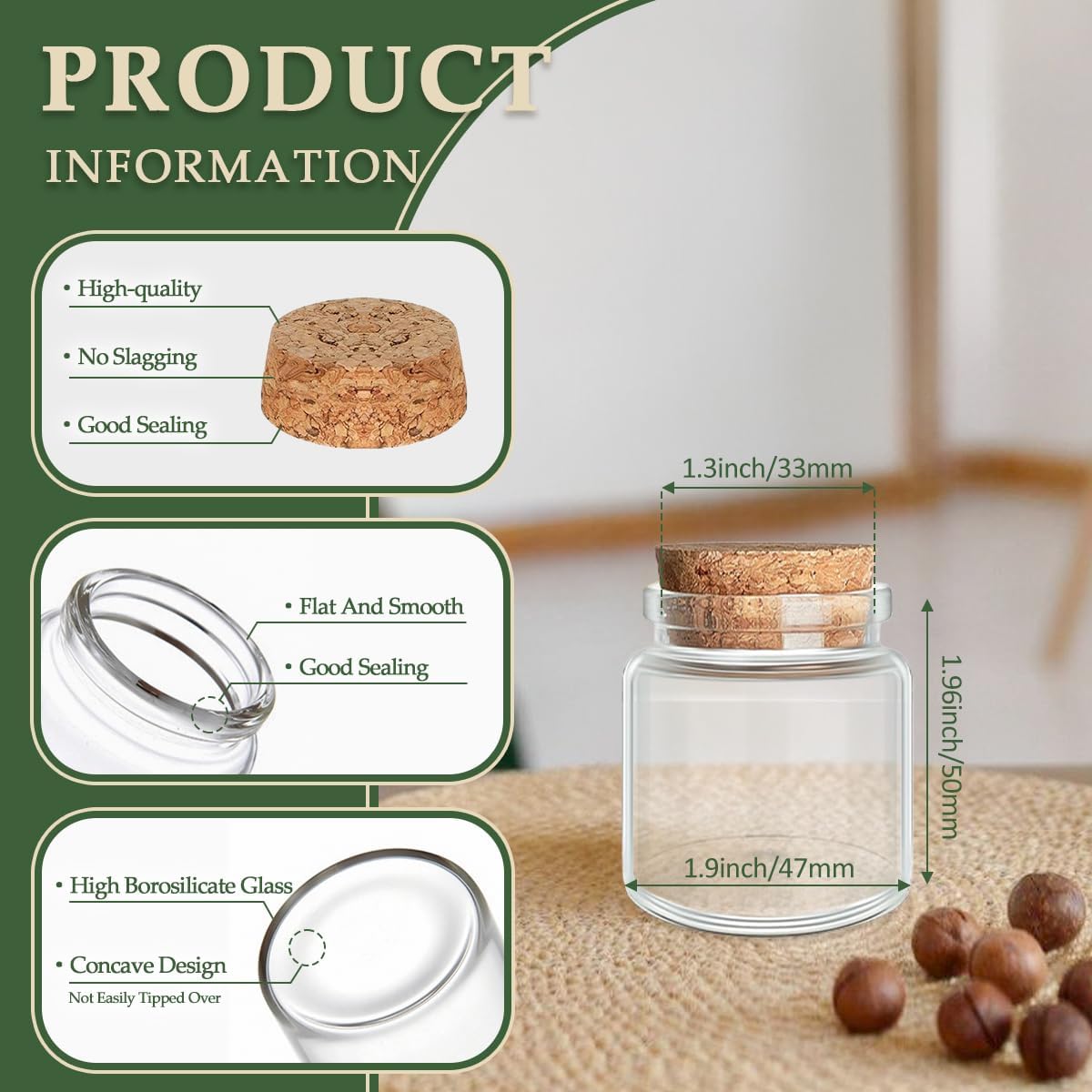 - Material : Glass + Wood cork;Bottle capacity:1.7 oz(50 ml)
