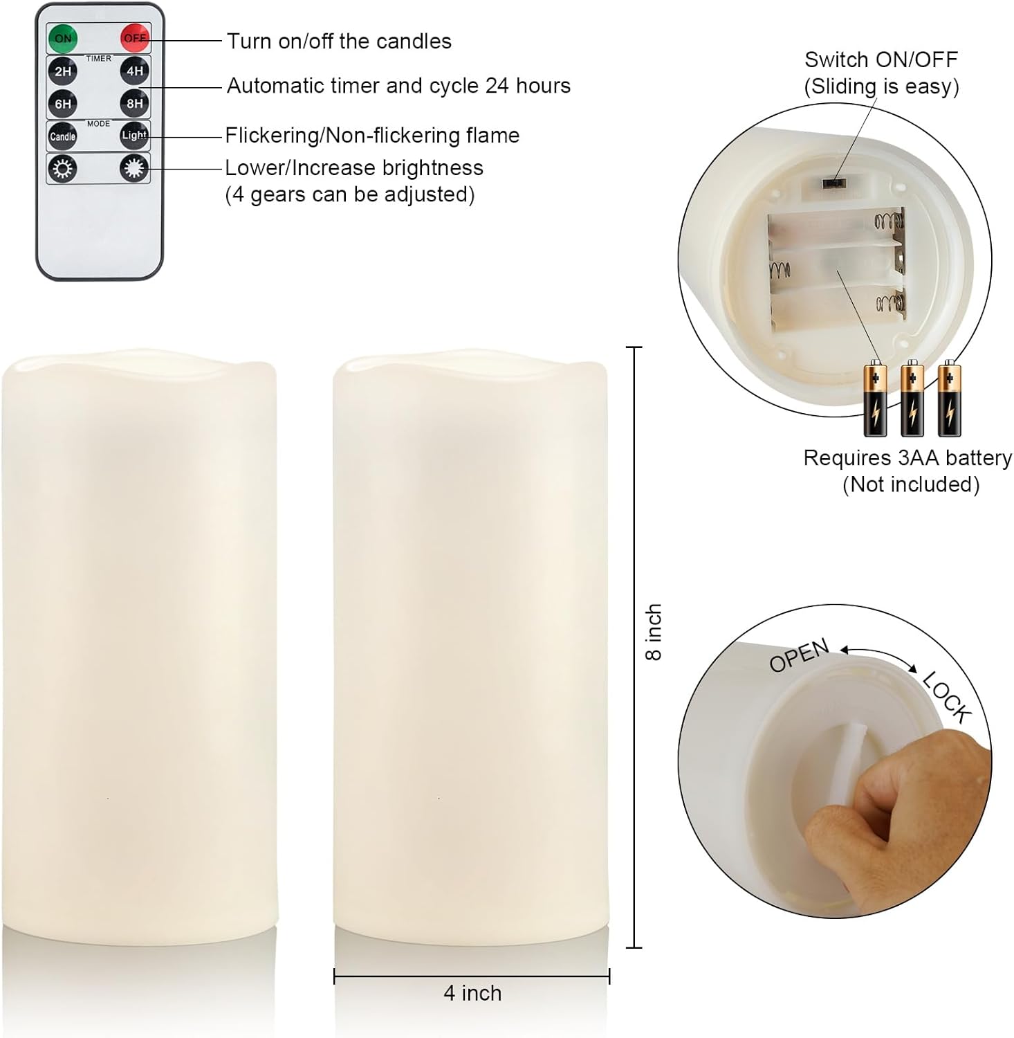 - Package Include 2x large outdoor candles (8” in height, 4” in diameter), 1x Remote Control, which are better using inside the indoor or outdoor lanterns. Please don’t soak them in water because prolonged soaking will invalidate the waterproof function.