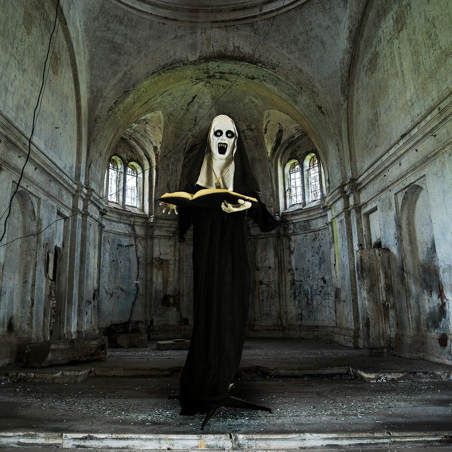 Haunted Hill Farm Life-Size Scary Talking Witch Nun Halloween Animatronic with Touch Activated Lights and Sound, Poseable, Battery Operated Indoor or Covered Outdoor Creepy Halloween Decorations
