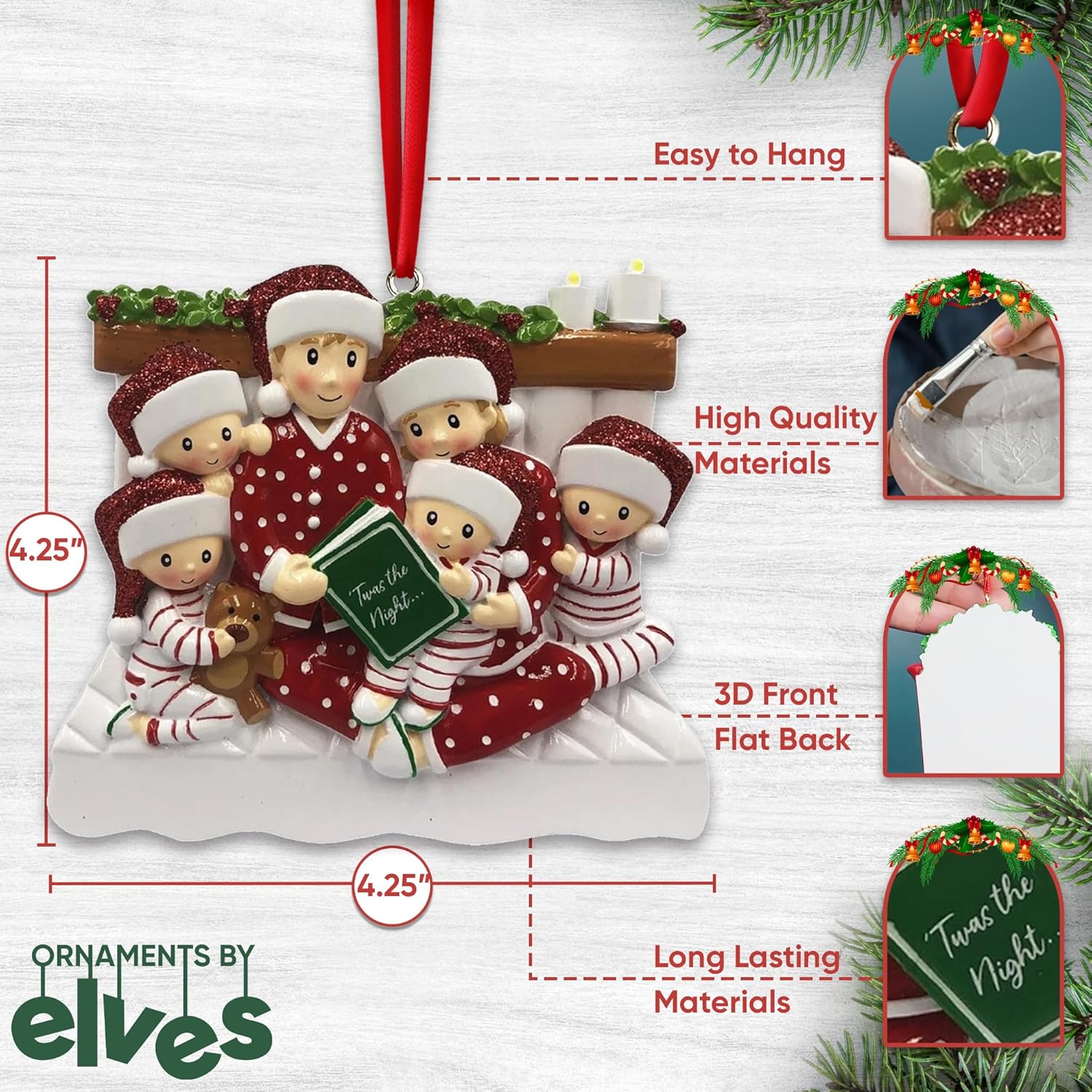 - đ Celebrate Your Family of 6: Mark a joyful milestone with a personalized family of 6 Christmas ornament 2025. Whether itâs your first year as six or part of a cherished tradition, this keepsake honors your growing bond and tells your story with warmth, love, and festive cheer. This bedtime Christmas story ornament captures a magical moment with a family of six in striped pajamas, all wearing glittery red Santa hats. Theyâre cozied up while holding âTwas the Night⌠book, surrounded by soft details like a teddy bear and holiday candles for extra warmth.