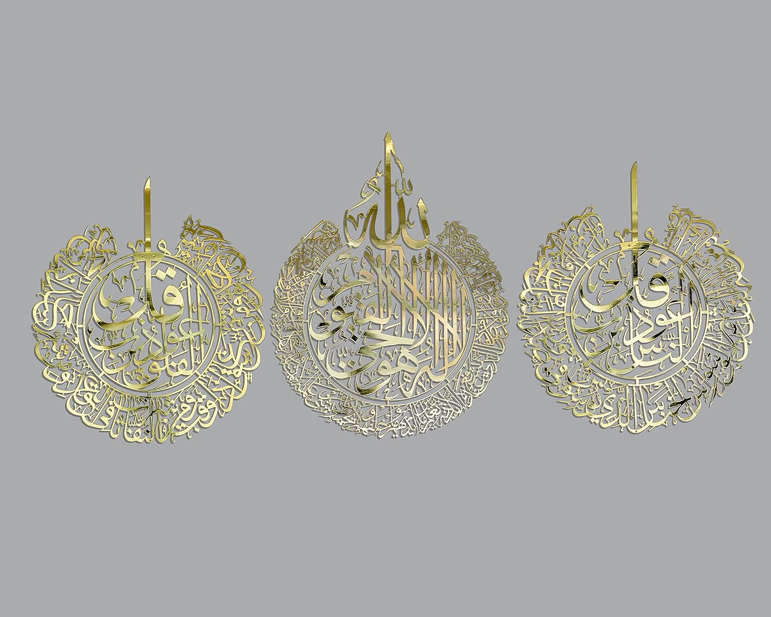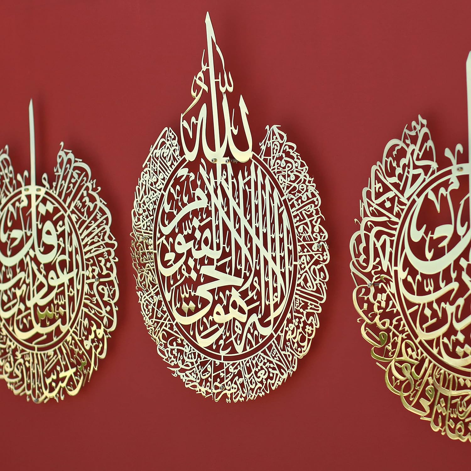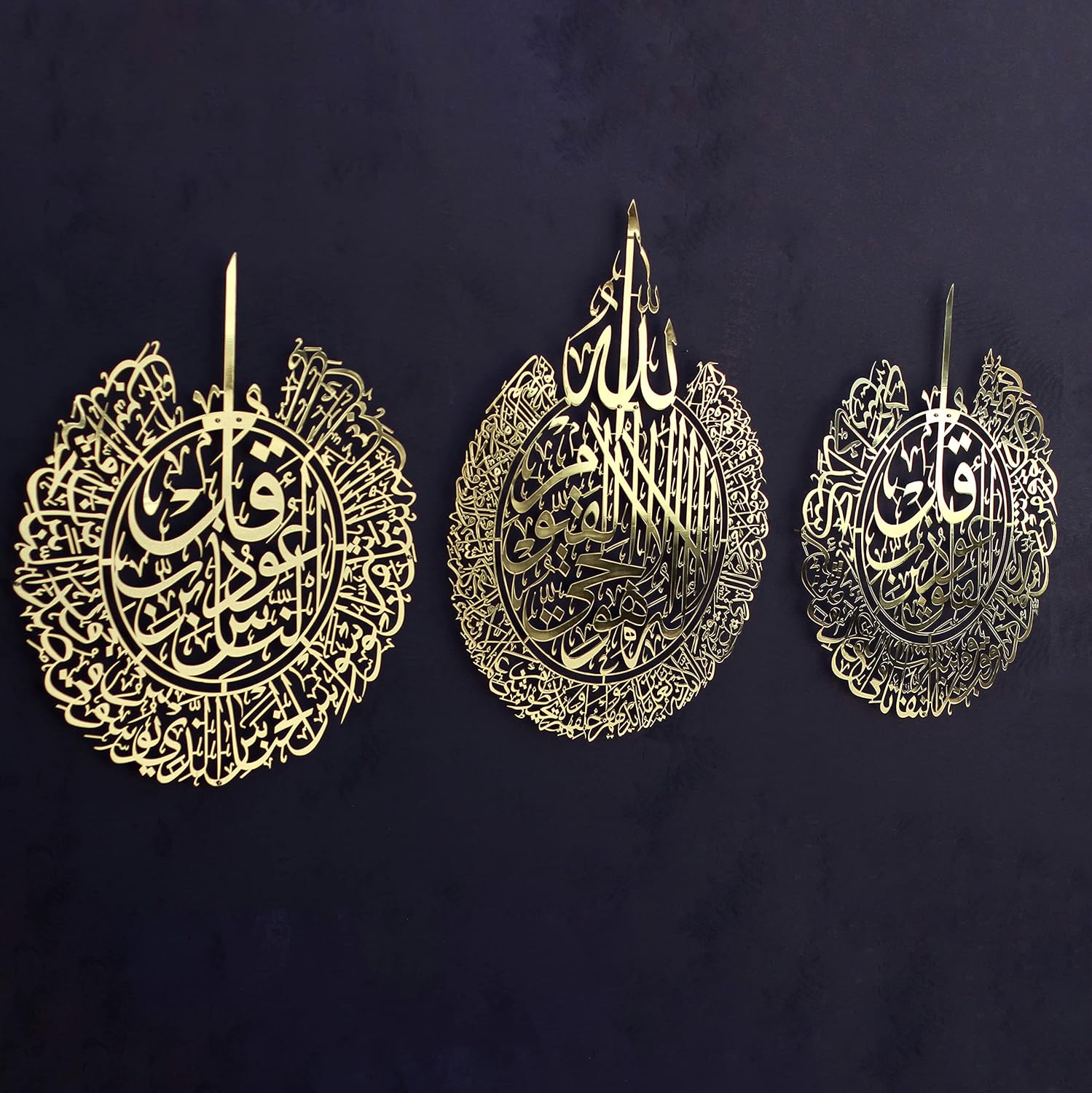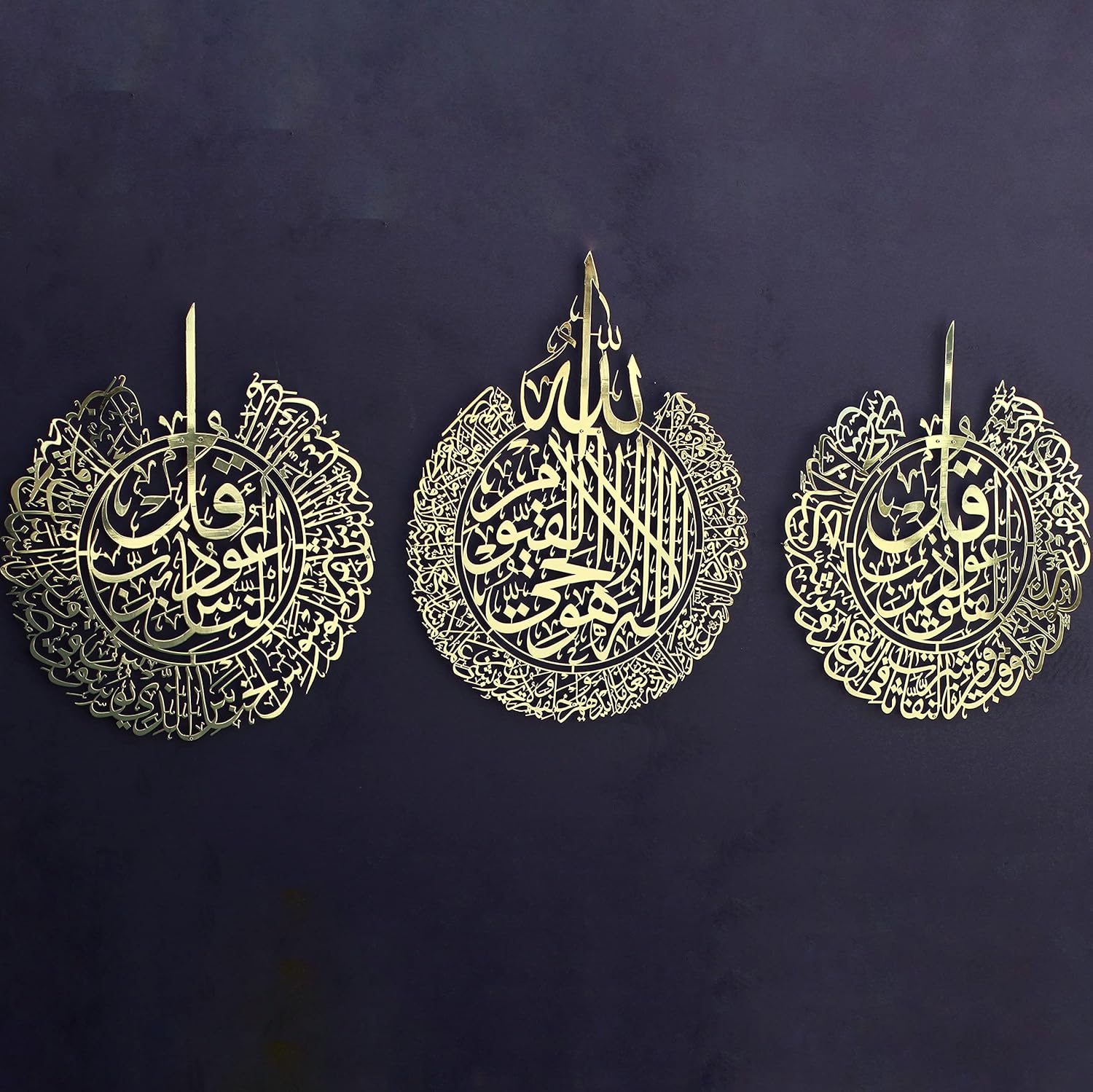 - The Elegance of Art: Crown your home with this elegant metal Islamic wall art. Featuring the Ayat al-Kursi, Surahs al-Falaq, and al-Nas, it's a magnificent union of Quranic verses and masterful Arabic calligraphy.