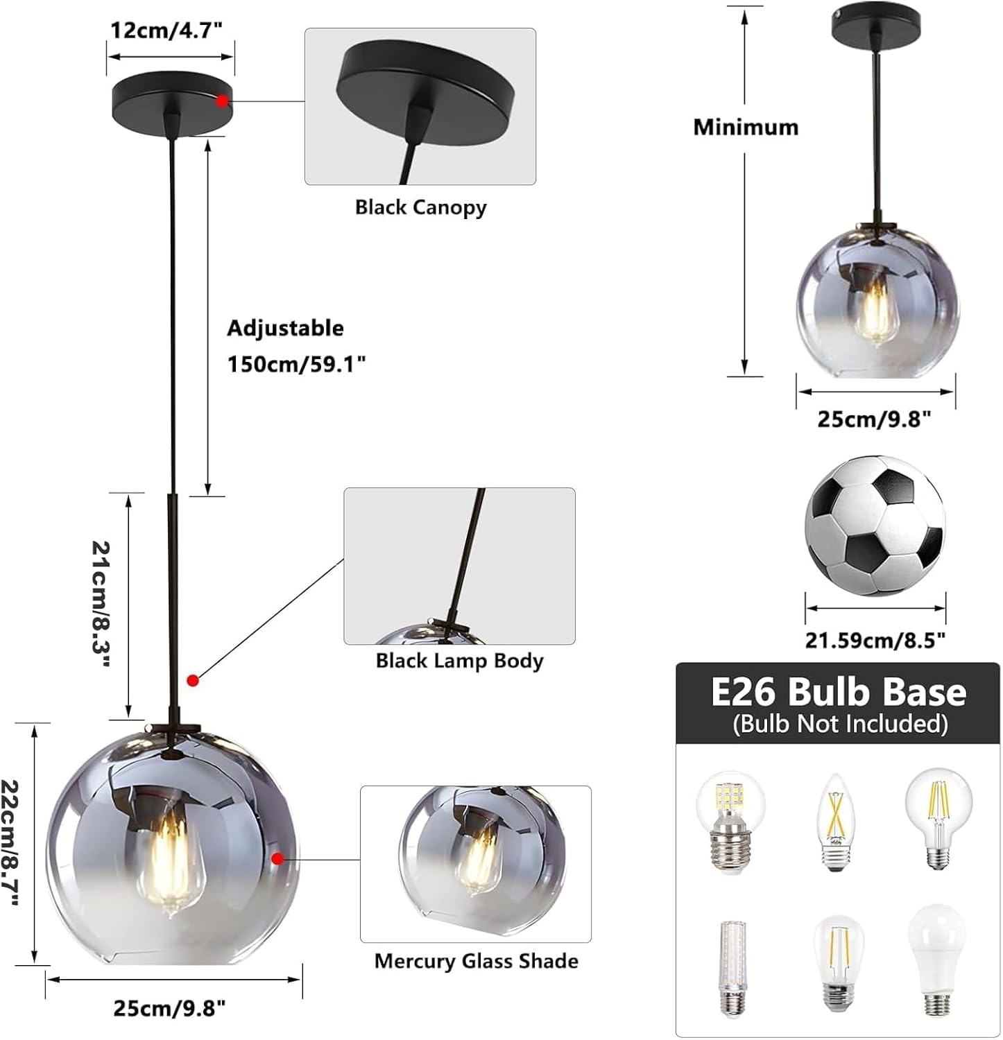 - Black Glass Pendant Light Size: The mercury glass ceiling light globe diameter: 9.8”(25cm), canopy: 4.7”(12cm). Light source: E26 (Bulb not included)(bulb replacement ASIN: B081WVNCVM), voltage: 110-220V for worldwide. The glass globe pendant light can be dimmable when work with dimmable bulb and switch