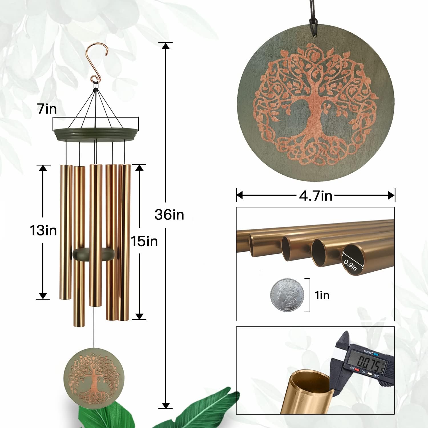 - Large 36" Outdoor Wind Chimes - Soothing Melodies--Total 36-inch hanging length with a heavy-duty metal hook for secure installation. Five expert-tuned metal tubes produce rich, harmonious sounds. Thick tubing walls enhance durability and sustain deep tones, paired with weather-resistant nylon cords and a hardwood striker for clear, reliable sound in all conditions.