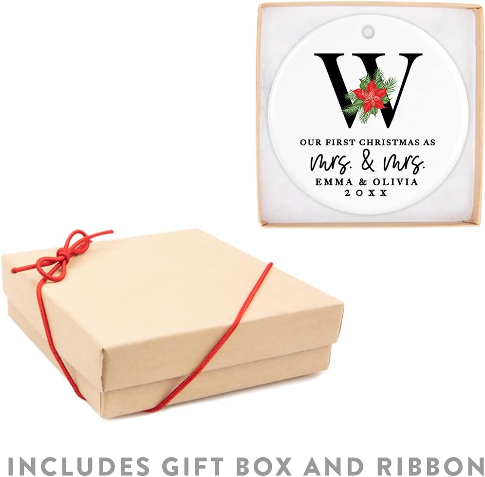Andaz Press Personalized Our First Christmas As Mrs. & Mrs. 2025 Christmas Ornaments Monogram Poinsettia 2.8" Round Porcelain Ceramic Lesbian Married Couple Gay Women Newlyweds Wedding Keepsake 1-Pack
