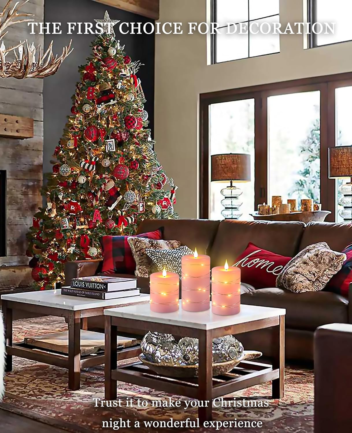 - Battery Powered Candles-Flameless Candles-Shining Stars: The real flame candle exudes a classic and noble atmosphere. The difference from traditional candles is the addition of starlight. Flameless candles with string lights, each candle is decorated with 12-16 small lamp beads, and each candle is surrounded by bright and delicate light. Wrapped in a silver string of lights, this is a unique aesthetic effect that combines a fairy-tale lighting appearance with classical beauty.