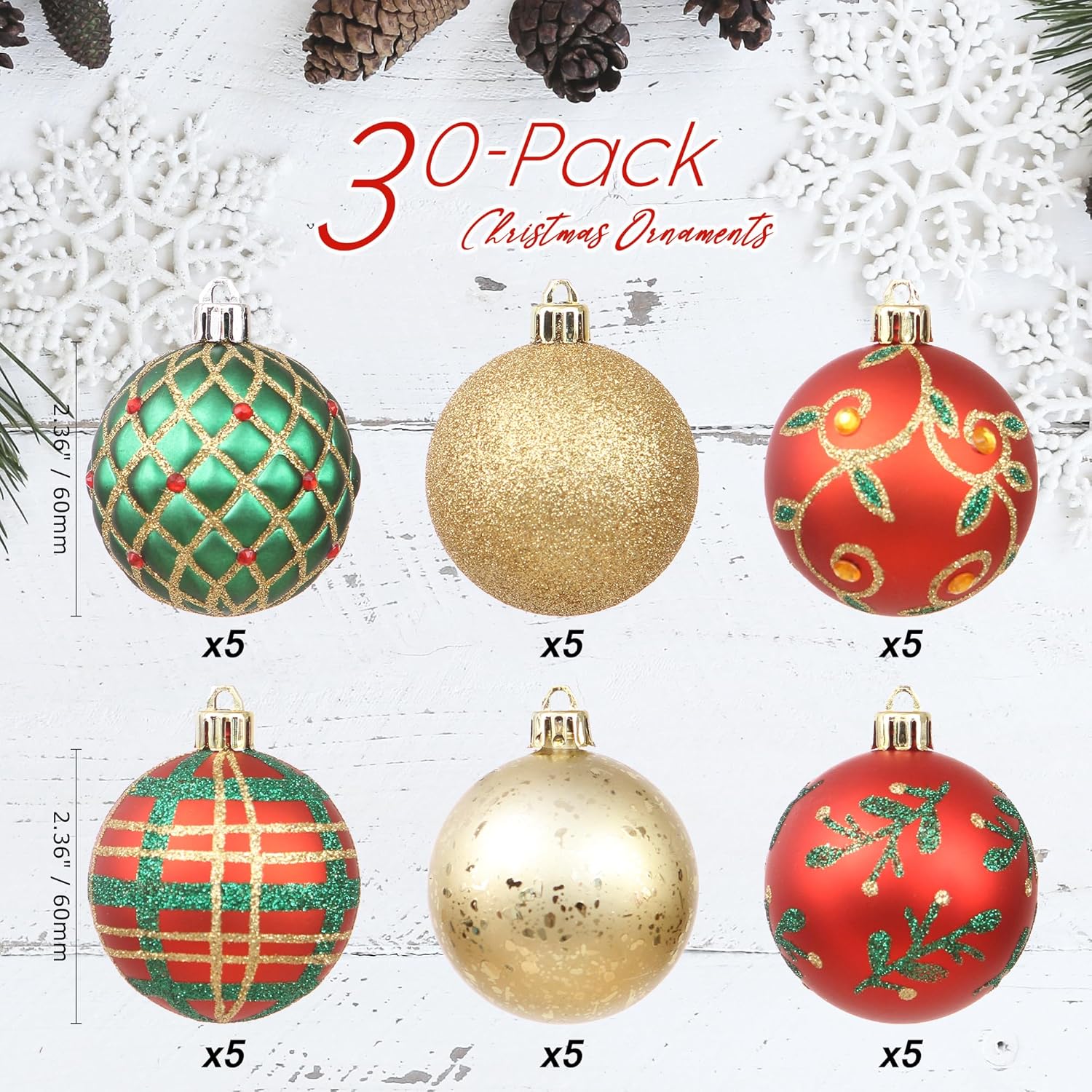 - 30-Pack 2.36 inches Medium Ball Ornaments - This set that you are looking comes with 30 pieces of ball ornaments in 1 box. Ball ornaments measure about 2.36"/60mm in diameter which is appropriate for a medium/big tree, wreath and garland