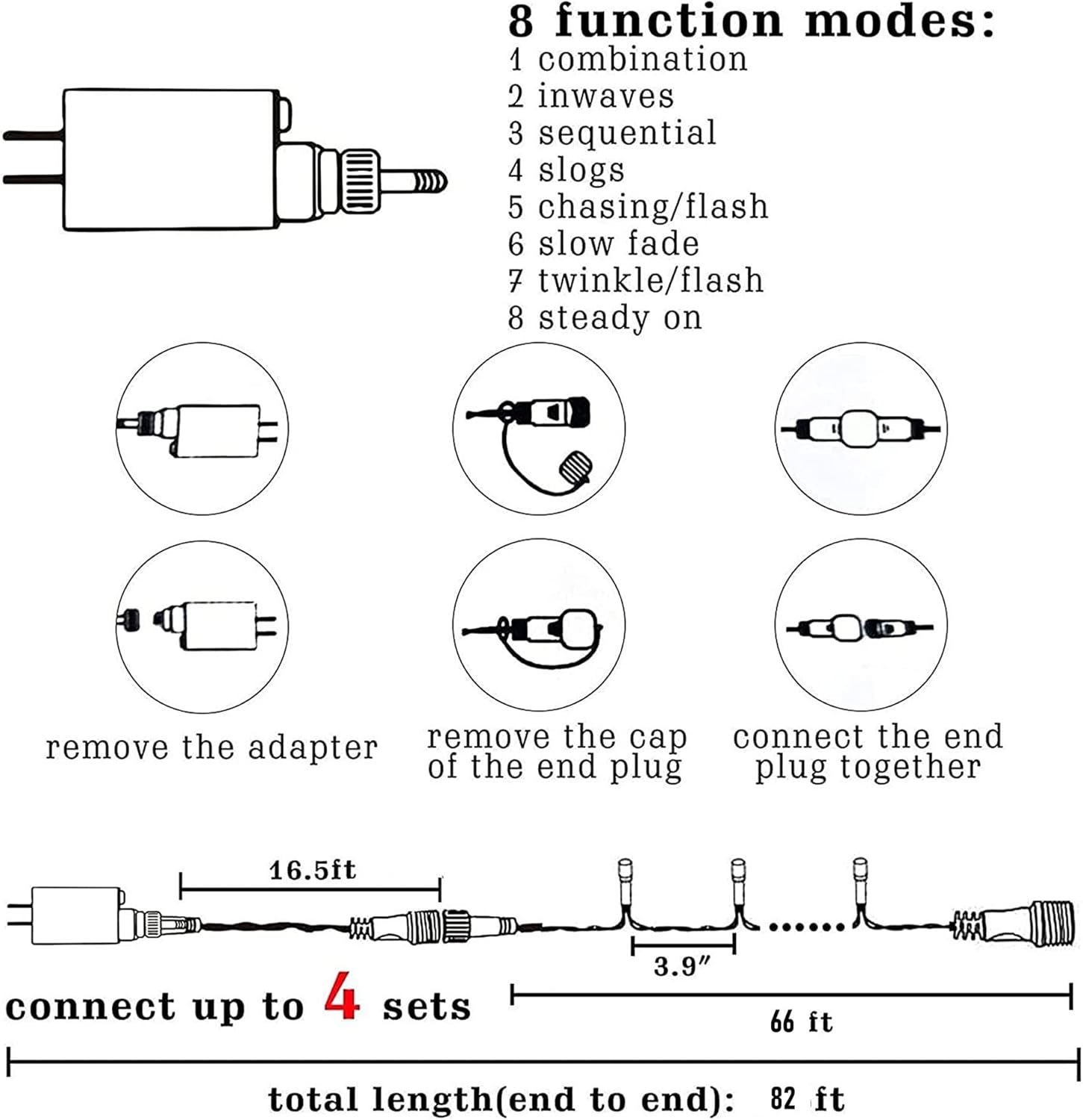- Christmas Decorations String Lights: Package Includes: 2 x 66 ft light string. Each string lights has 200 individual LED bulbs, the lead wire is 16.5 feet, total length is 82.5 ft, and the bulb spacing is 3.9 inches. Each string lights has end-to-end connection, you can connect up to 4 sets together to illuminate a wider range, available for different decorative use.