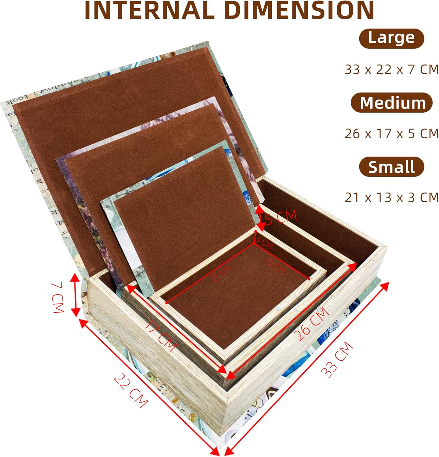 - This set of fake book boxes consists of three large, medium and small boxes. Large Book Box: External Size: 13" × 8.5" × 2.75"/ Internal Size: 11.7" × 7.5" × 2.3" Middle Book Box: External Size: 10.2" × 6.5" × 1.9"/ Internal Size: 8.8" × 5.5" × 1.5" Small book box: Outer size: 8.2" × 5" × 1.1"/ Inner size: 7" × 3.9" × 0.8"