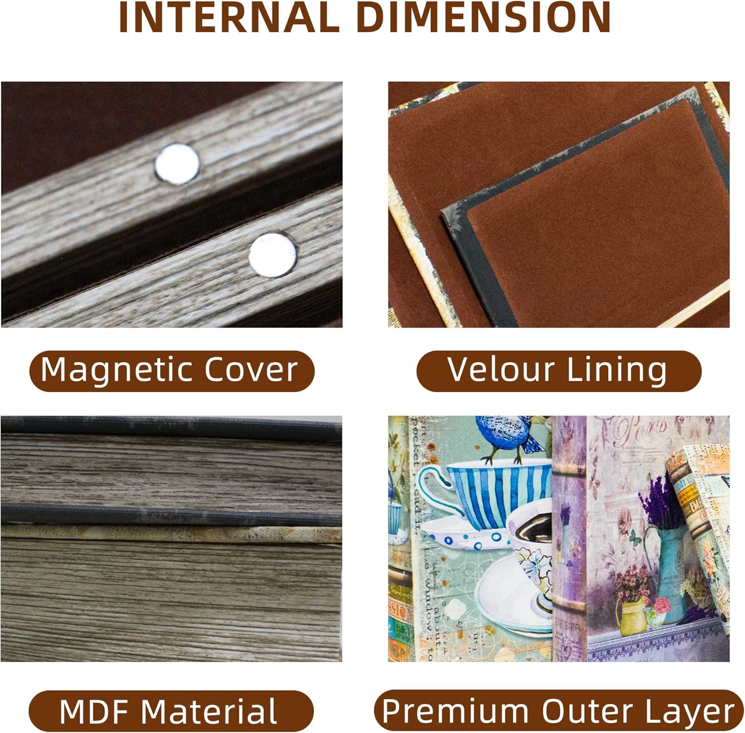 - This decorative book box is made of MDF and has a lid with a magnetic snap to prevent the contents from falling out. The interior of book box is lined with fleece, and the whole book box is high-end and beautiful.It is the best choice for Christmas gifts