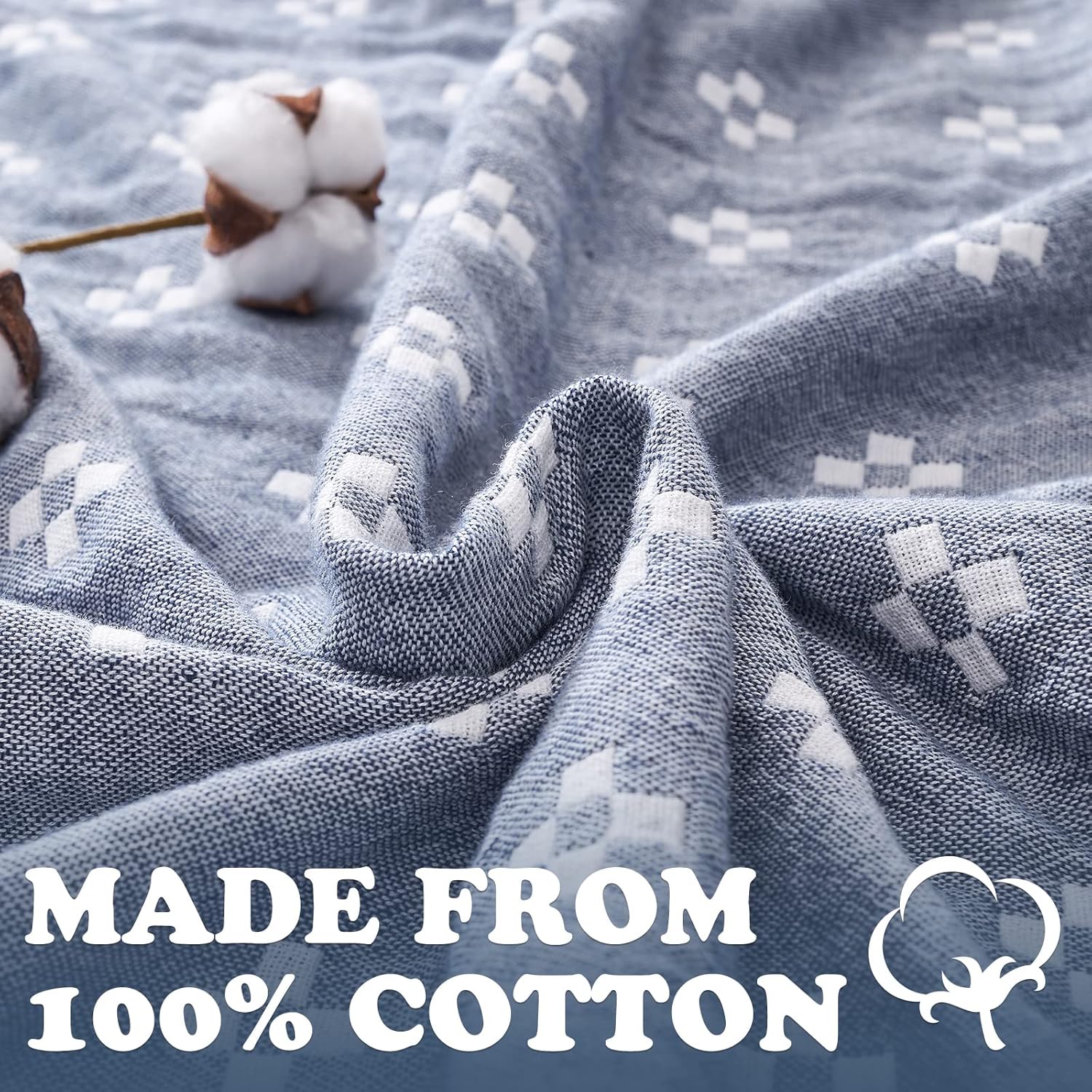 jinchan Boho 100% Cotton Blanket Muslin 50x60 Inches Lightweight 3-Layer Geometric Cross Pattern Reversible Quilt Throw Soft Breathable Comfy All Seasons for Couch Bed Decor, Blue