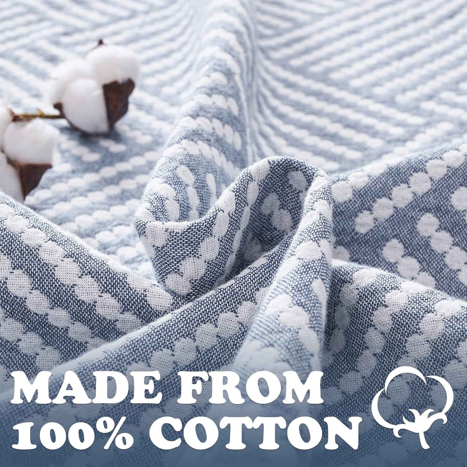 jinchan Boho 100% Cotton Blanket Muslin 50x60 Inches Lightweight 3-Layer Geometric Square Striped Pattern Reversible Quilt Throw Soft Breathable Comfy All Seasons for Couch Bed Decor, Blue