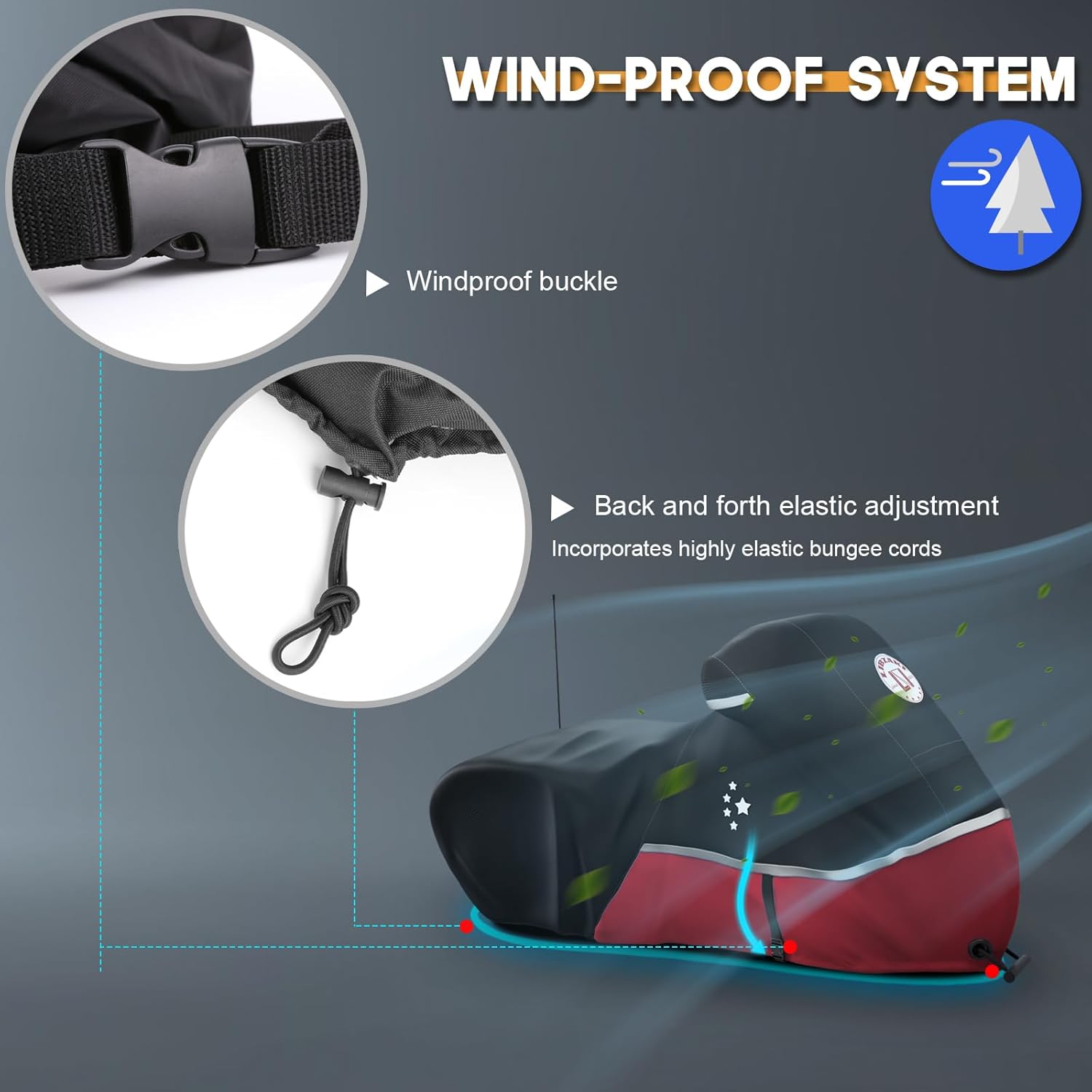 - Details Improvement : Adjustable elastic band is added to the whole circle of the bottom of the motorcycle cover, with an adjustable windproof buckle in the center, which can be adjusted to make the cover and the motorcycle tighter. In addition, the front section of the cover has an ABS lock hole.