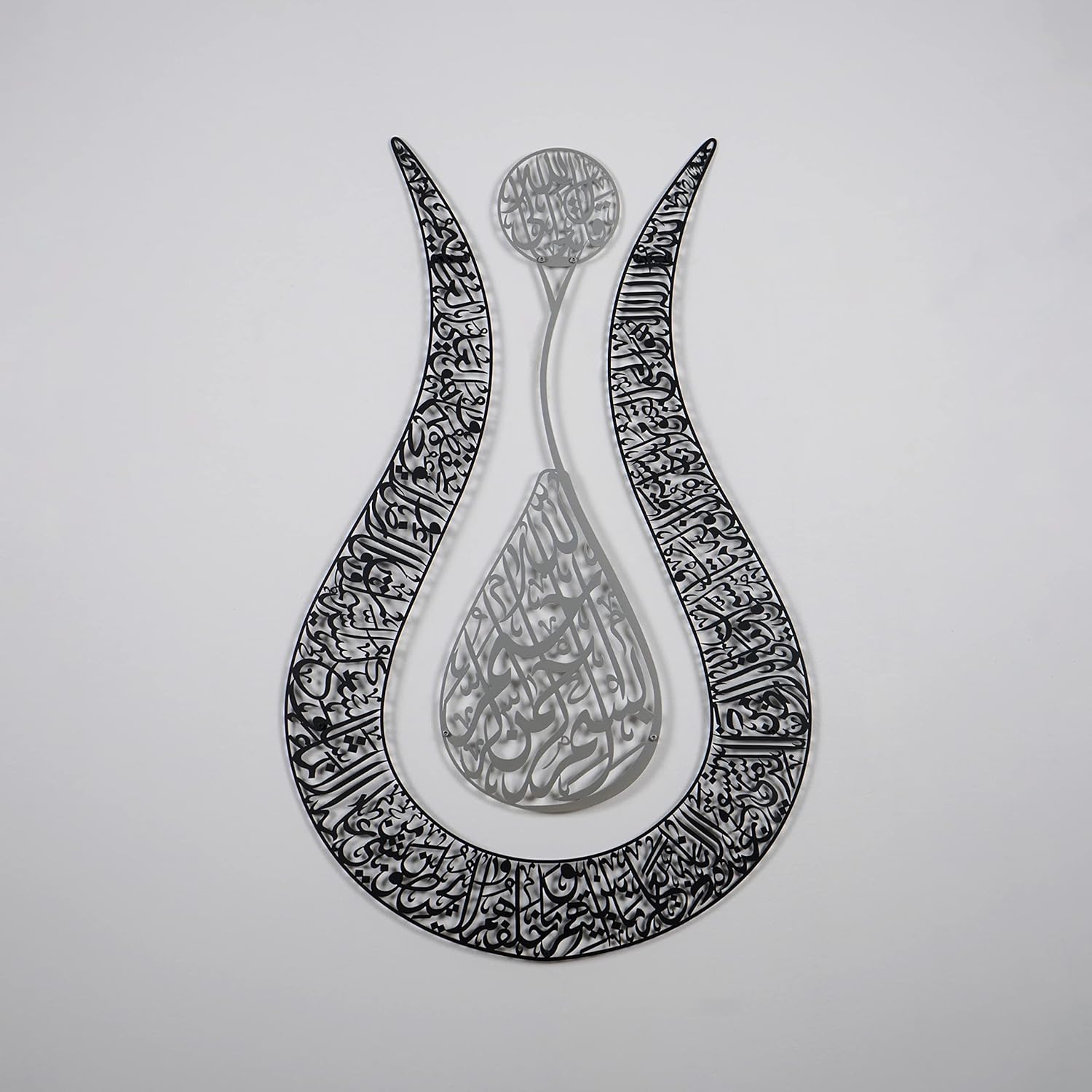 Ayatul Kursi Tulip Shaped Metal Islamic Wall Art, Throne Verse Arabic Calligraphy Decor, Quran Decor Gift for Muslims at Ramadan and Hajj (67 x 43 cm | 26.8 x 17.2 inches, In Silver | Out Black)