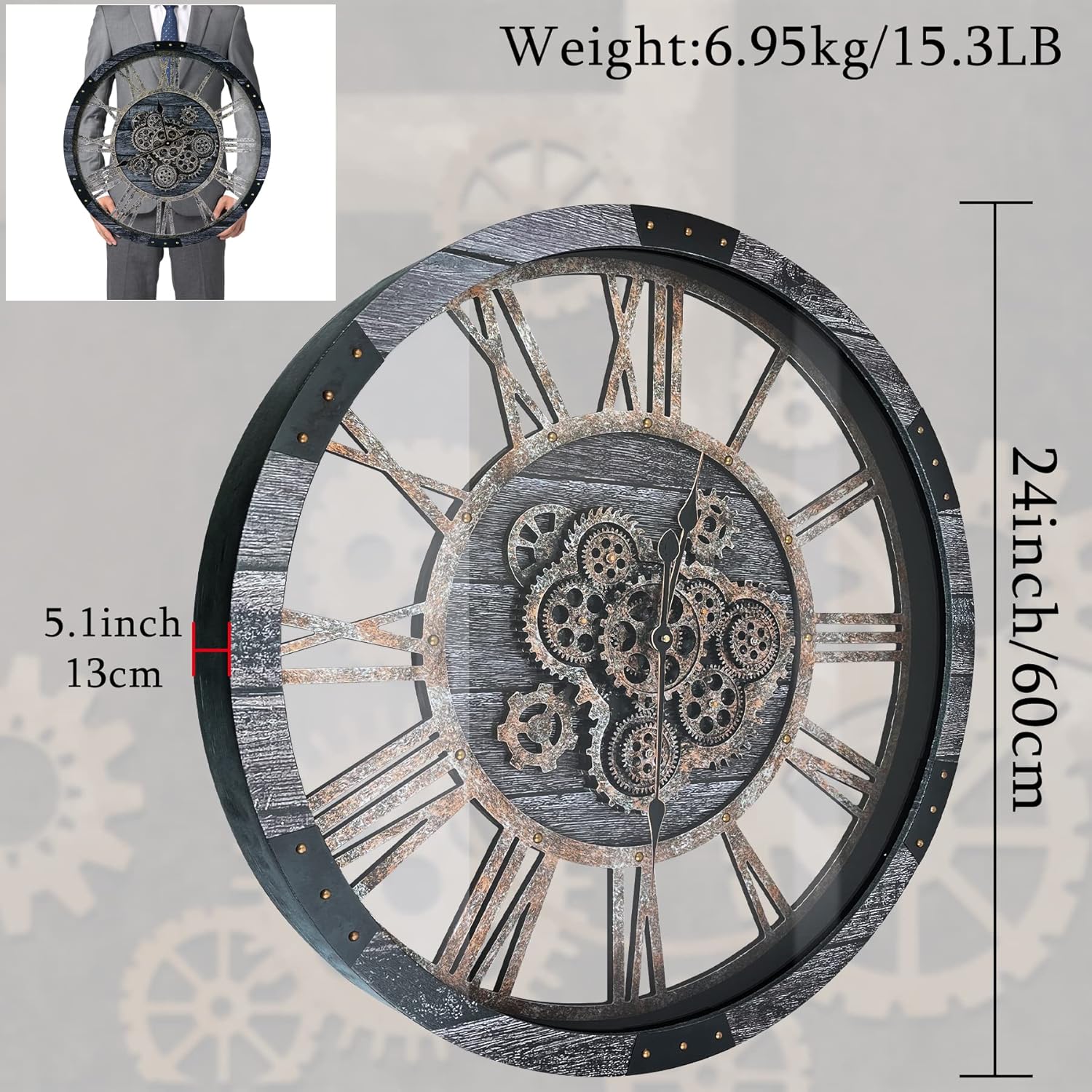 24 Inch Industrial Steampunk Wall Clock, Oversized Solid Wood Frame, Battery Operated, Large Wall Clock with Real Rotating Gears, Gray