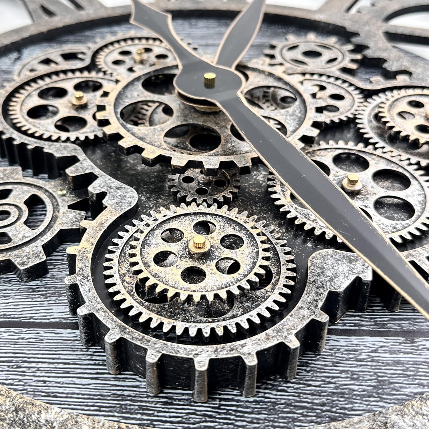 - 【Real Moving Gear Clock】All gears for the wall clock are real moving! Design with rustic bronze-color and industrial style. An creative combination of four gears for a retro look, has a very exquisite decorative effect makes the wall clock become a chic art works. The large wall clock crafted of nature wood & MDF. Big roman numeral numbers and wood rustic moving gears perfect for any room decor.
