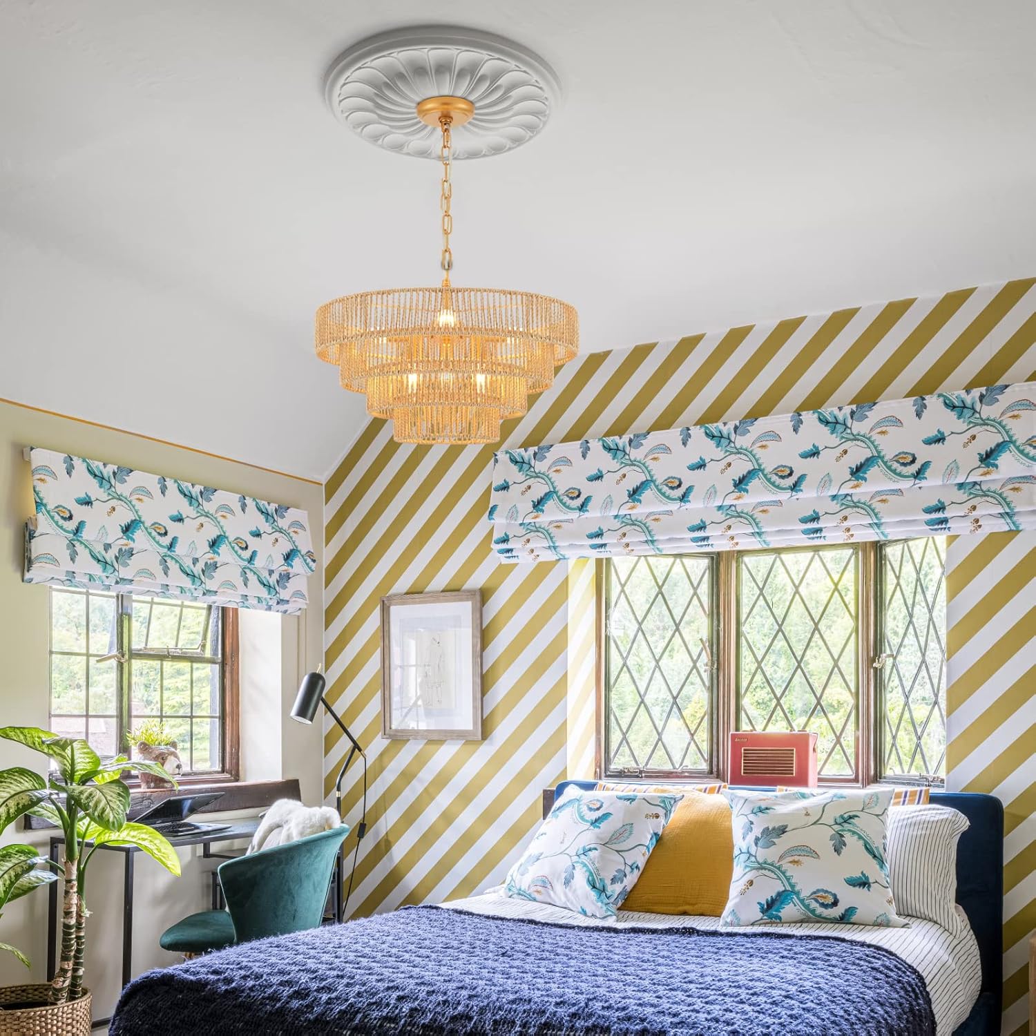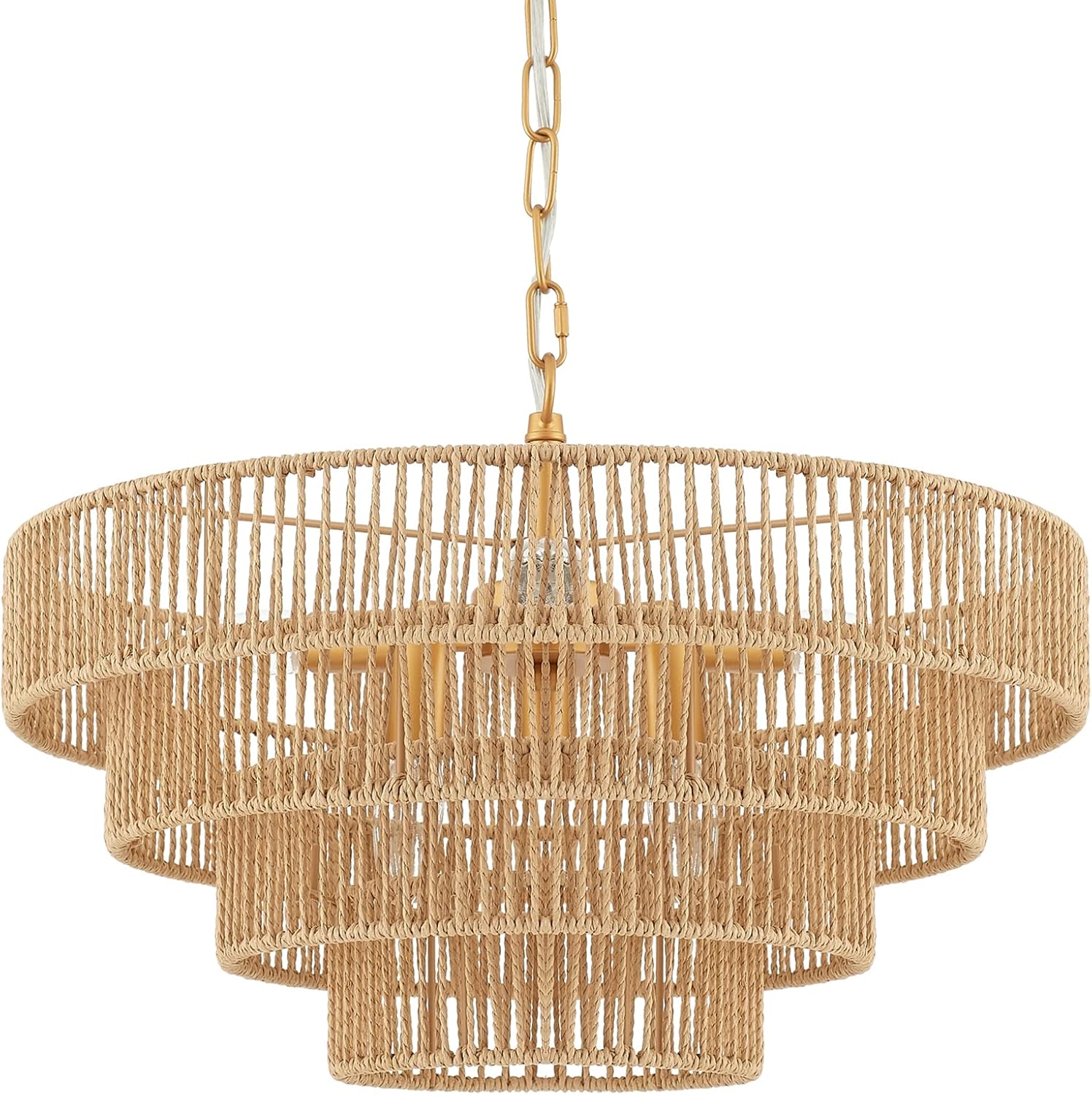 - Eye-Catching Design: This woven rattan chandelier is made of wicker woven on natural wood color with high-quality 4 round metal frames finished by brass, forming a semicircular hollow cage, combining modern and traditional feelings to your home.