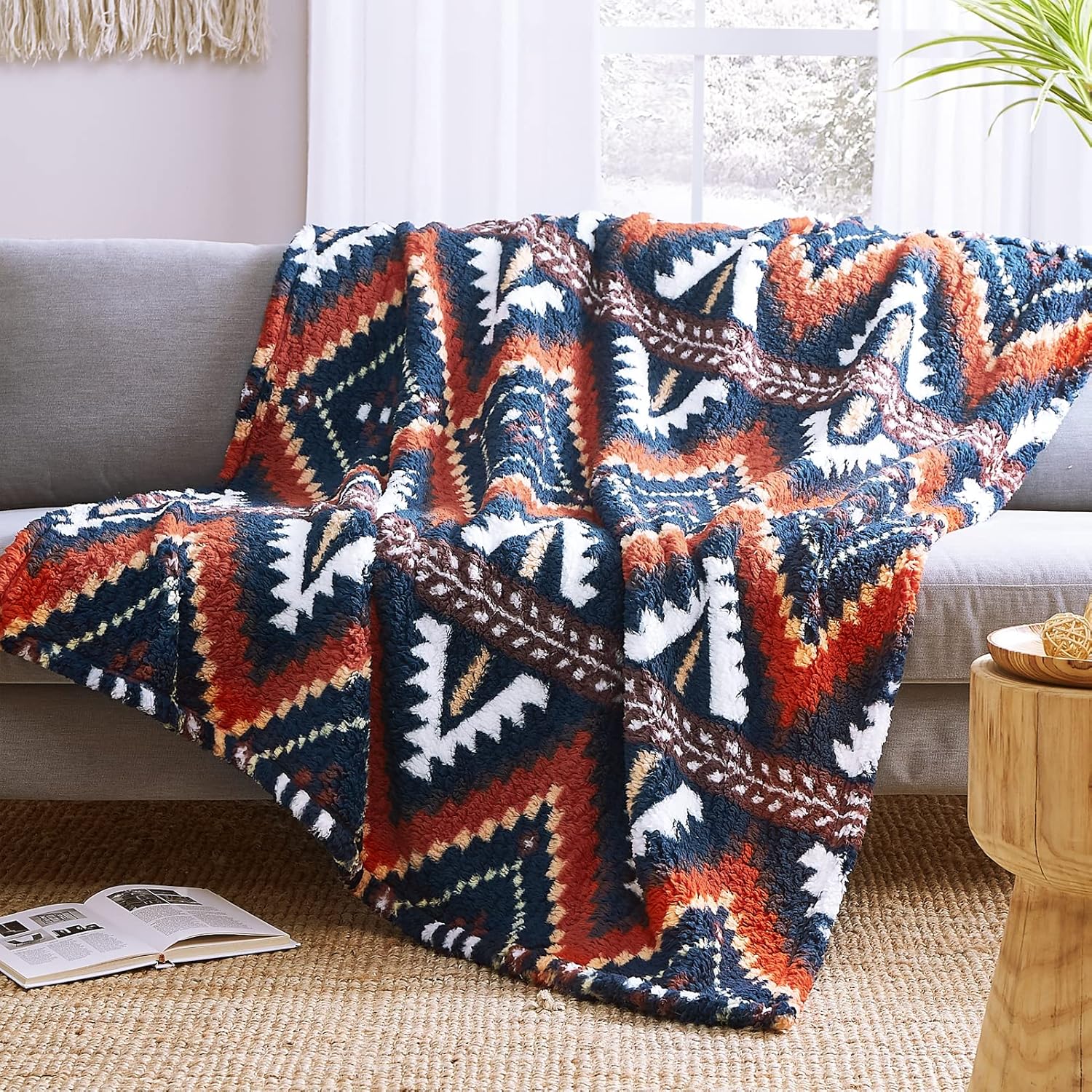 CASAAGUSTO Boho Sherpa Throw Blanket, Aztec Throw, Ultra Soft, Warm, Cozy, Plush, Thick Fleece Bohemian Throw Blanket for Couch, Bed, Sofa (Navy Blue 50 * 60 Inch)