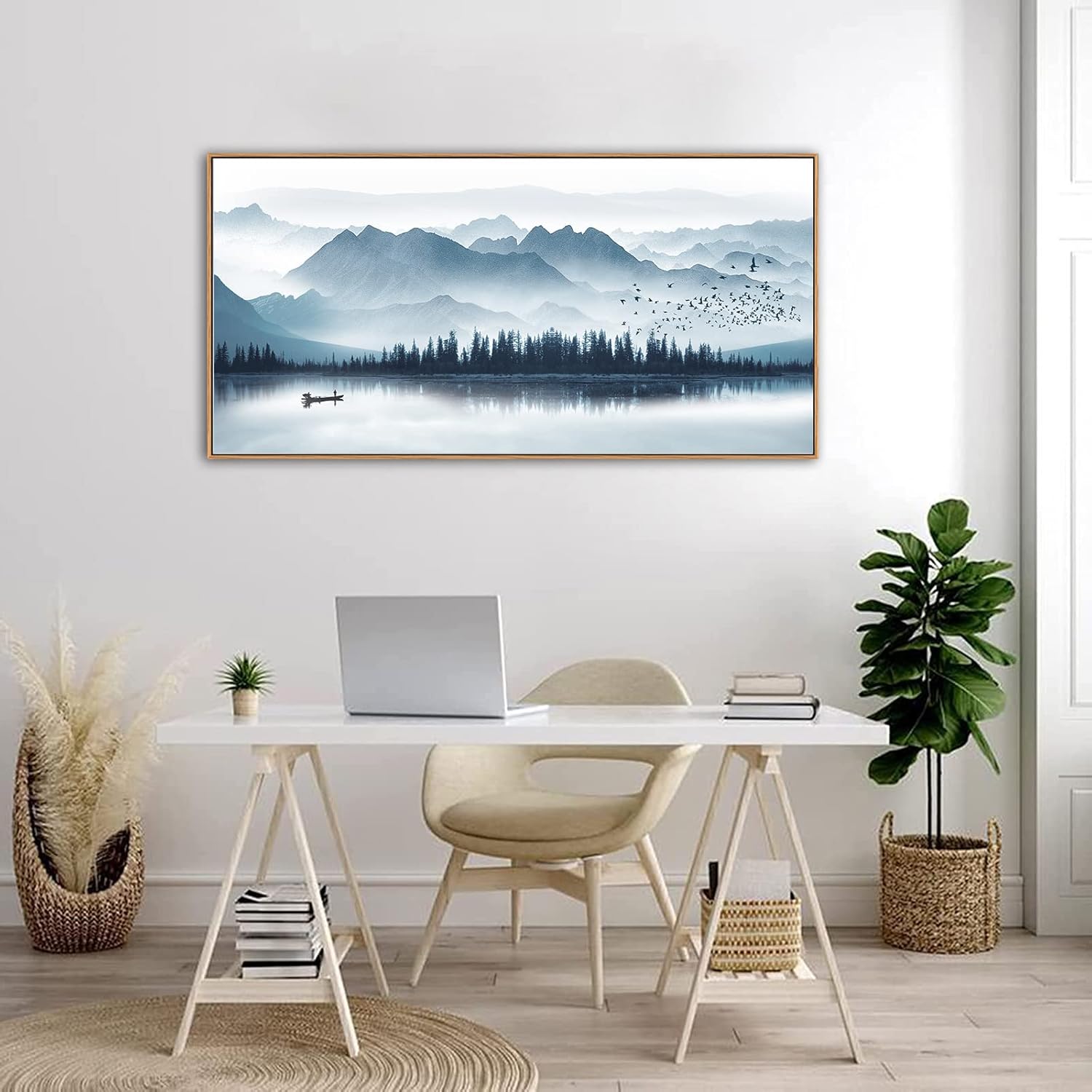 Indigo Framed Canvas Wall Art Misty Mountain Wall Pictures Foggy Lake Boat Canvas Painting Prints Forest Birds Canvas Wall Decor for Living Room Bedroom Decorations Natural Framed 24" x 48"