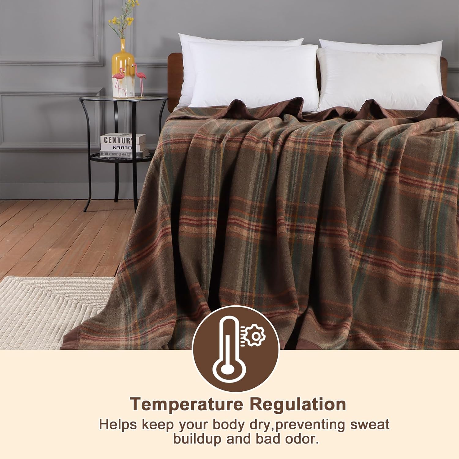 YOUR MOON 100% Pure Merino Wool Queen Size, Australian Organic Natural Wool Blanket, Hypoallergenic Wool Blanket for Bed, Medium Weight(Plaid Brown, 90 * 90)