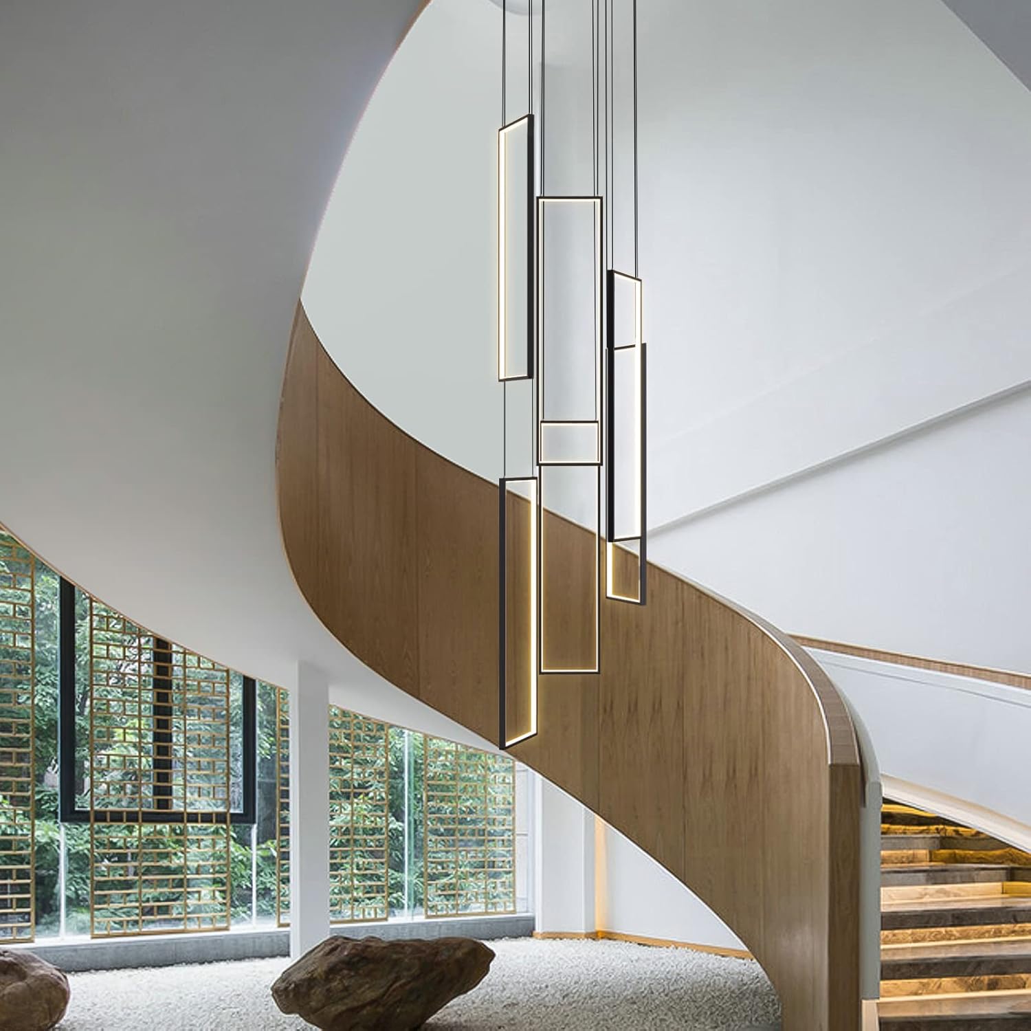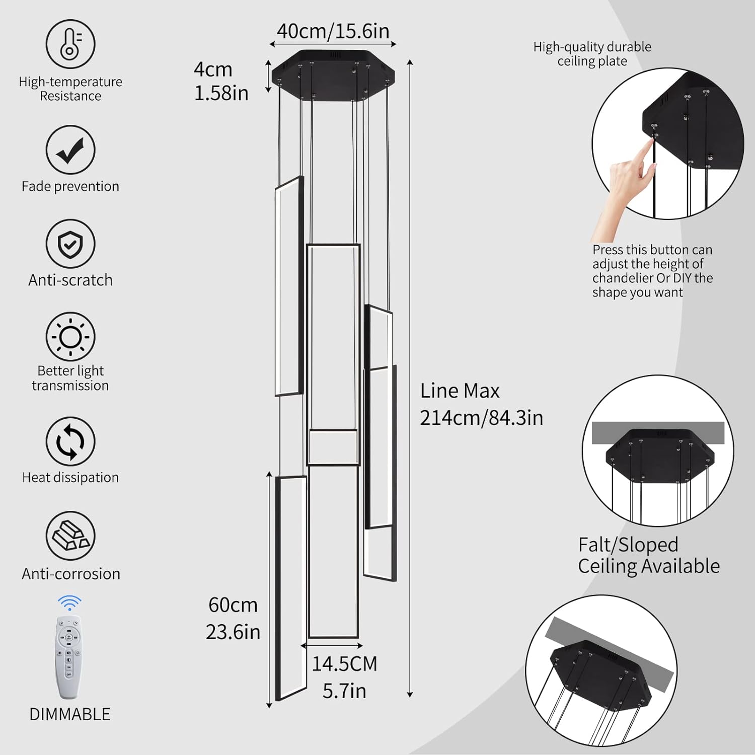 - [ LED Chandelier Applicable scene ]: Rectangular High Ceiling Chandelier Very suitable for modern home design Adjustable Black Chandelier can be DIY to various shapes easily by adjusting the cables Hanging Modern Ceiling Light with remote Suitable for Foyer, Staircase, Hallway, Kitchen Island, Craft Room, Hotel, Villa, Large living room with high ceiling Etc.