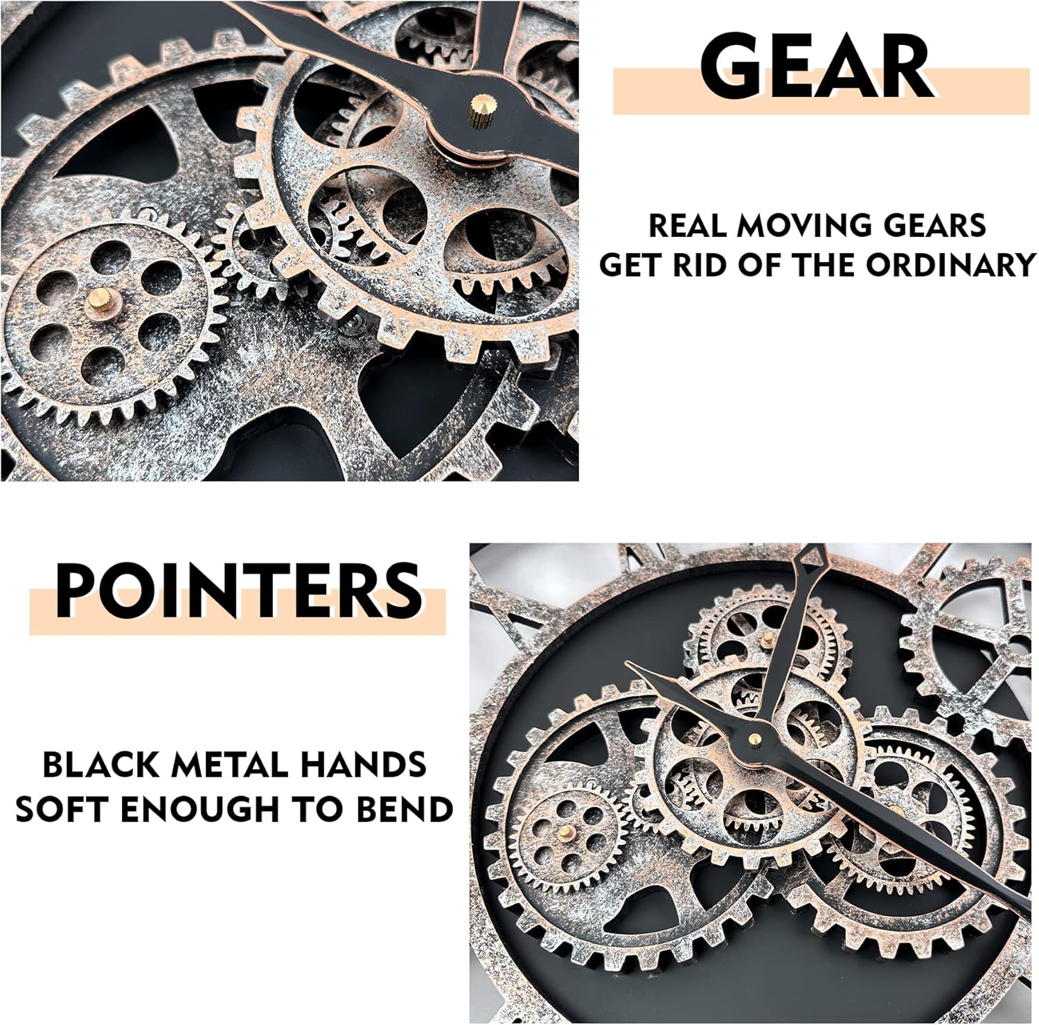 - REAL MOVING GEARS: Large wall clock with unique moving parts is as attractive as it is functional. Put batteries in, various gears start rotating fluently. Moving gear wall clock is amazing looking on the wall and will get so many compliments on it. Made from solid wood and painted by Rust-like color on wall clock create a very rustic and industrial atmosphere. Farmhouse wall clock is professionally handmade and pursuit of naturalness, so it may have some little imperfections.