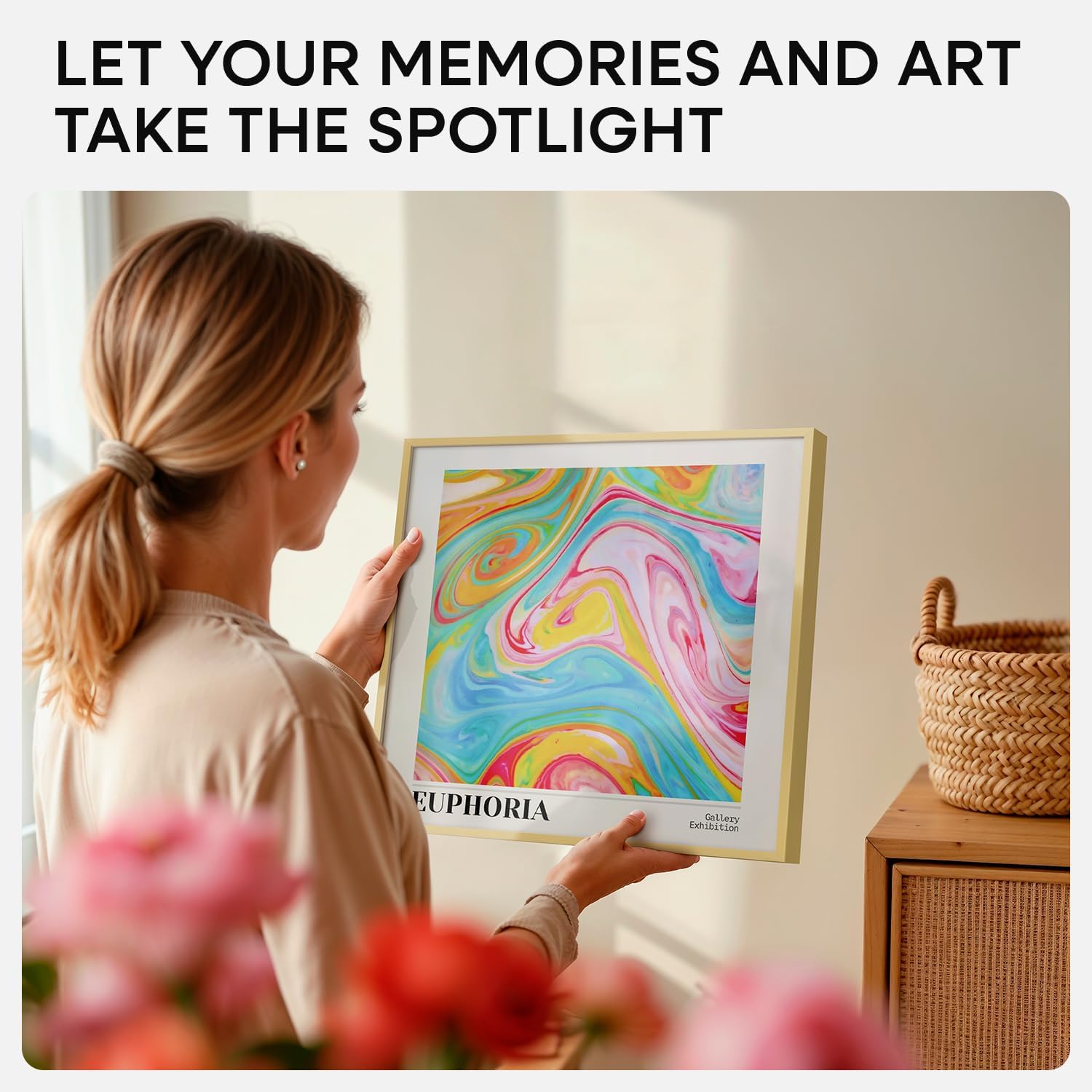 Homeforia 12x12 Picture Frame Gold, High End Metal 12 x 12 Square Poster Frame with Mat 10 x 10 Photo, 12x12 Frame Matted to 10x10 Print, 12by12 Gold Hanging Frames, Tempered Glass, Wall Kit, Set of 1