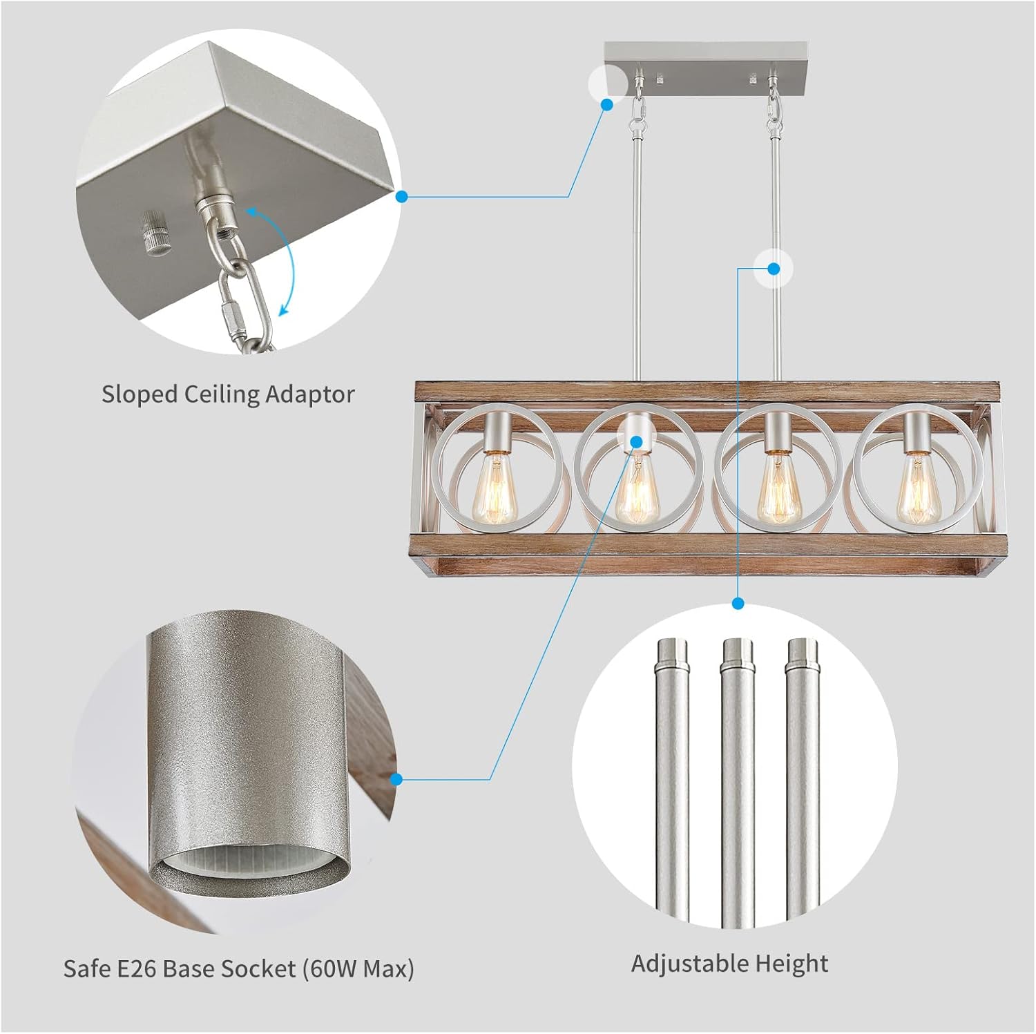 - LIGHT SOURCE: 4 x E26 (Max 60W, Not Included), suitable for LED, CFL, halogen or incandescent bulb and and work with a compatible dimmer switch (Not Included), casting a soft glamour for your dining rooms or kitchen island when the rustic chandelier lighting is on. Bulb base is UL safety standard.