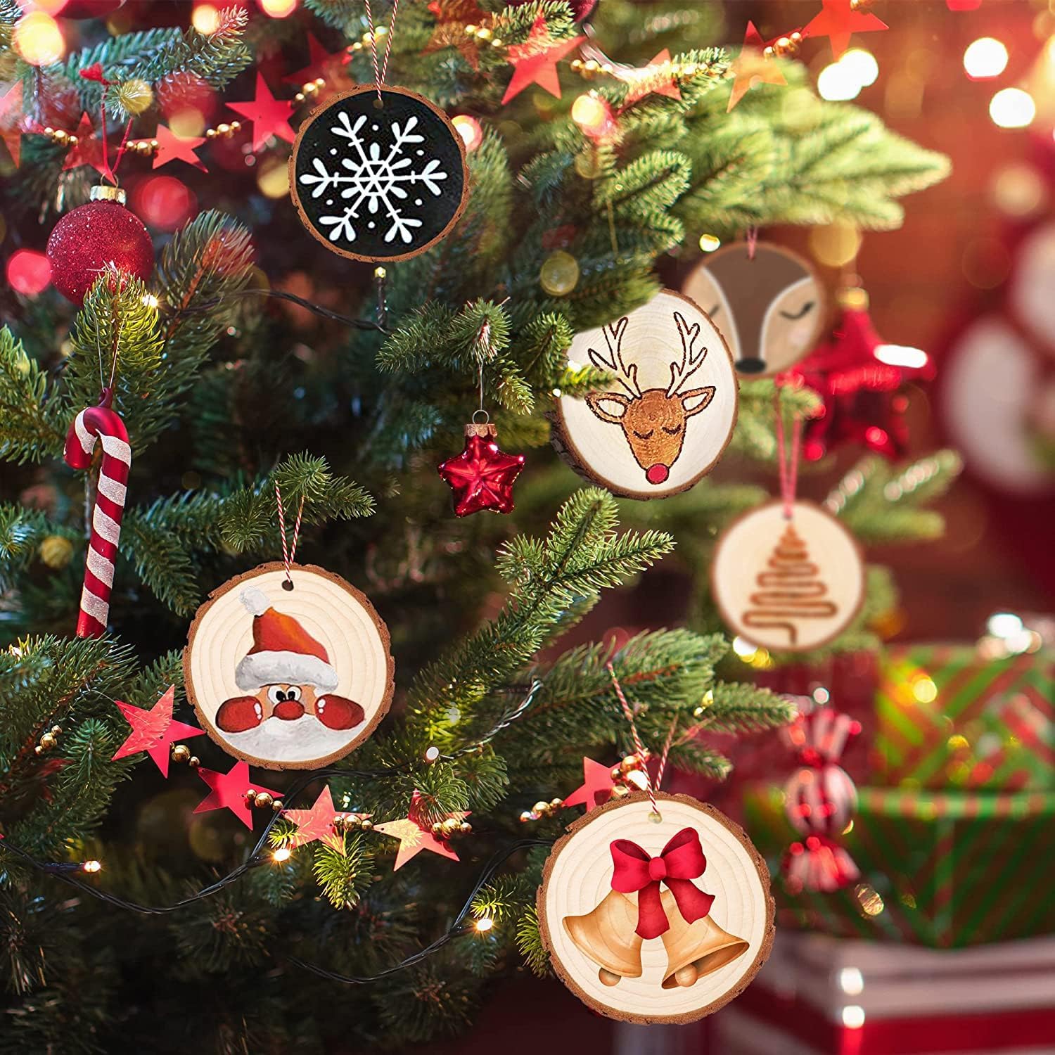 - [WOOD SLICE ORNAMENTS] Our natural pine wood christmas tree ornaments kit includes 30 pieces predrilled wood rounds for ornaments with a jute rope 33ft and a red-and-white cotton rope 33ft. Wood pieces for crafts are approximately 2.4-2.8 inches in diameter and 0.4 inches thickness, which will be the perfect size for a toddler hand! All 30 pcs wood circles for crafts are of equal quality and in perfect condition. These blank wood ornaments for christmas tree will exceed your expectations!