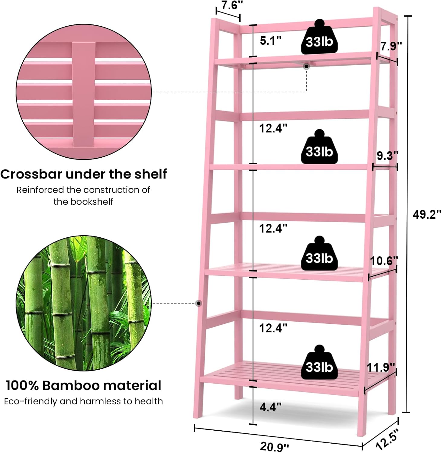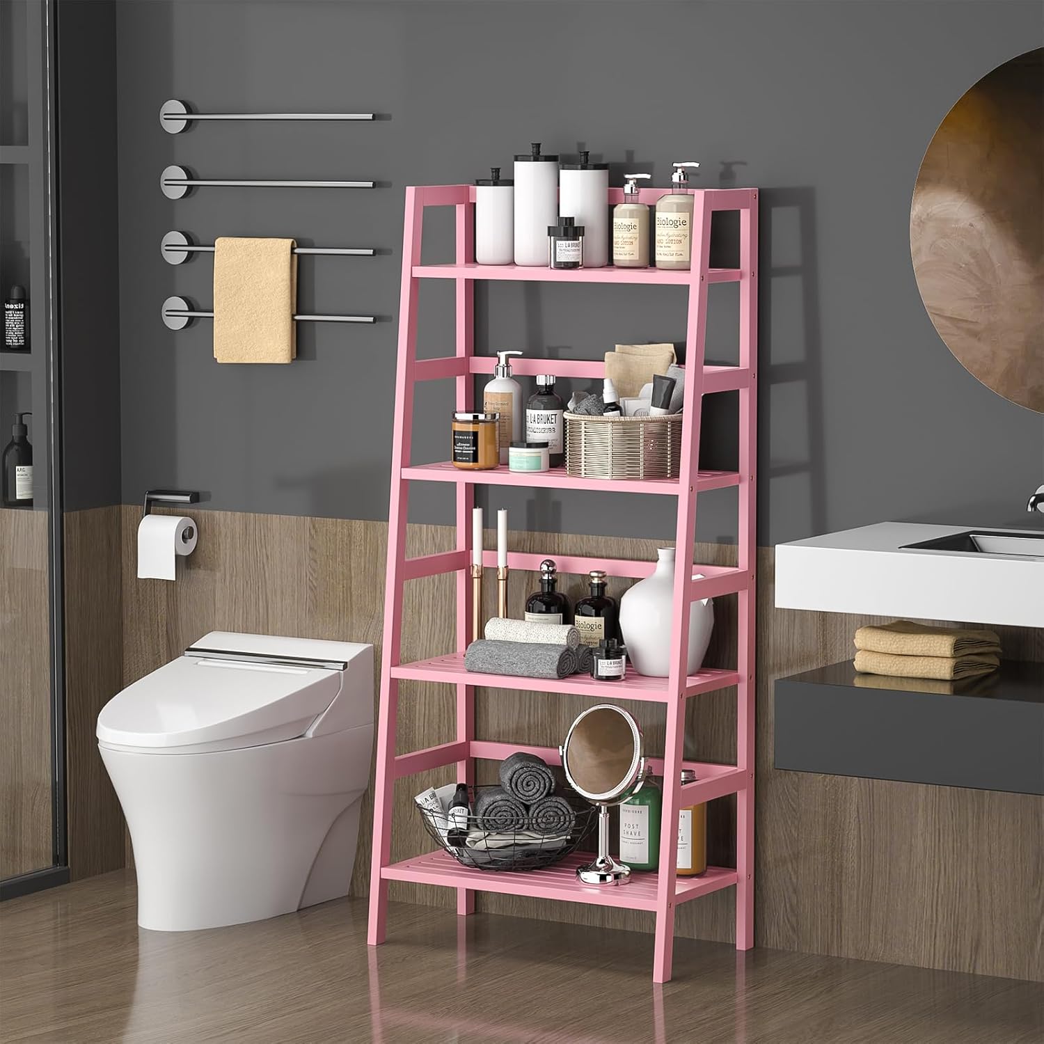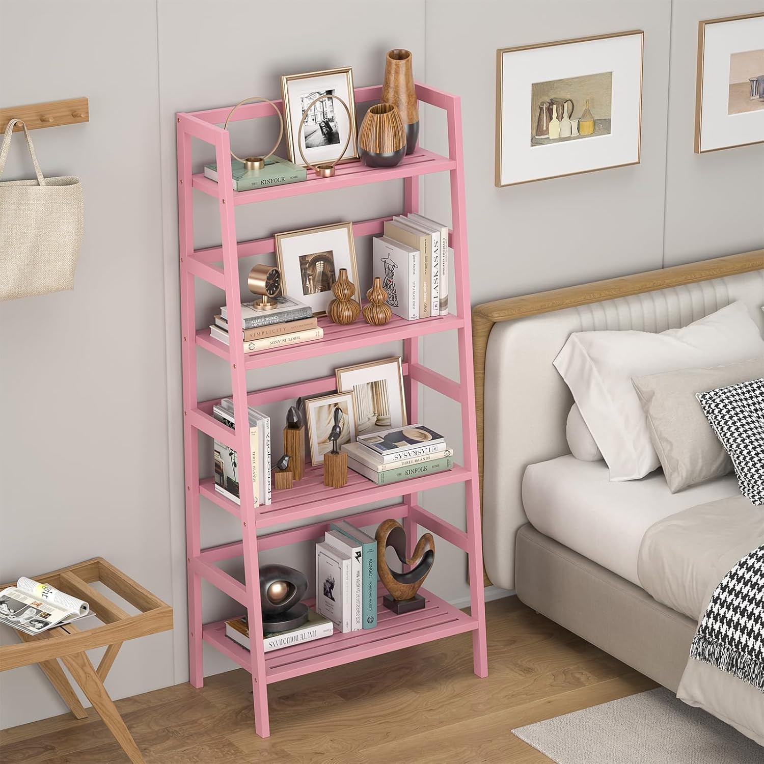 - MULTIFUNCTIONAL LADDER SHELF - Add this pink bamboo ladder shelf to any room in your home to instantly create a romantic feel. It can be used as a bookcase, bathroom shelf, plant stand, storage organizer in your living room, bedroom, bathroom, kitchen, hallway, or any other space. Straight back allows you to place this storage shelf neatly against a wall, angled front saves space.