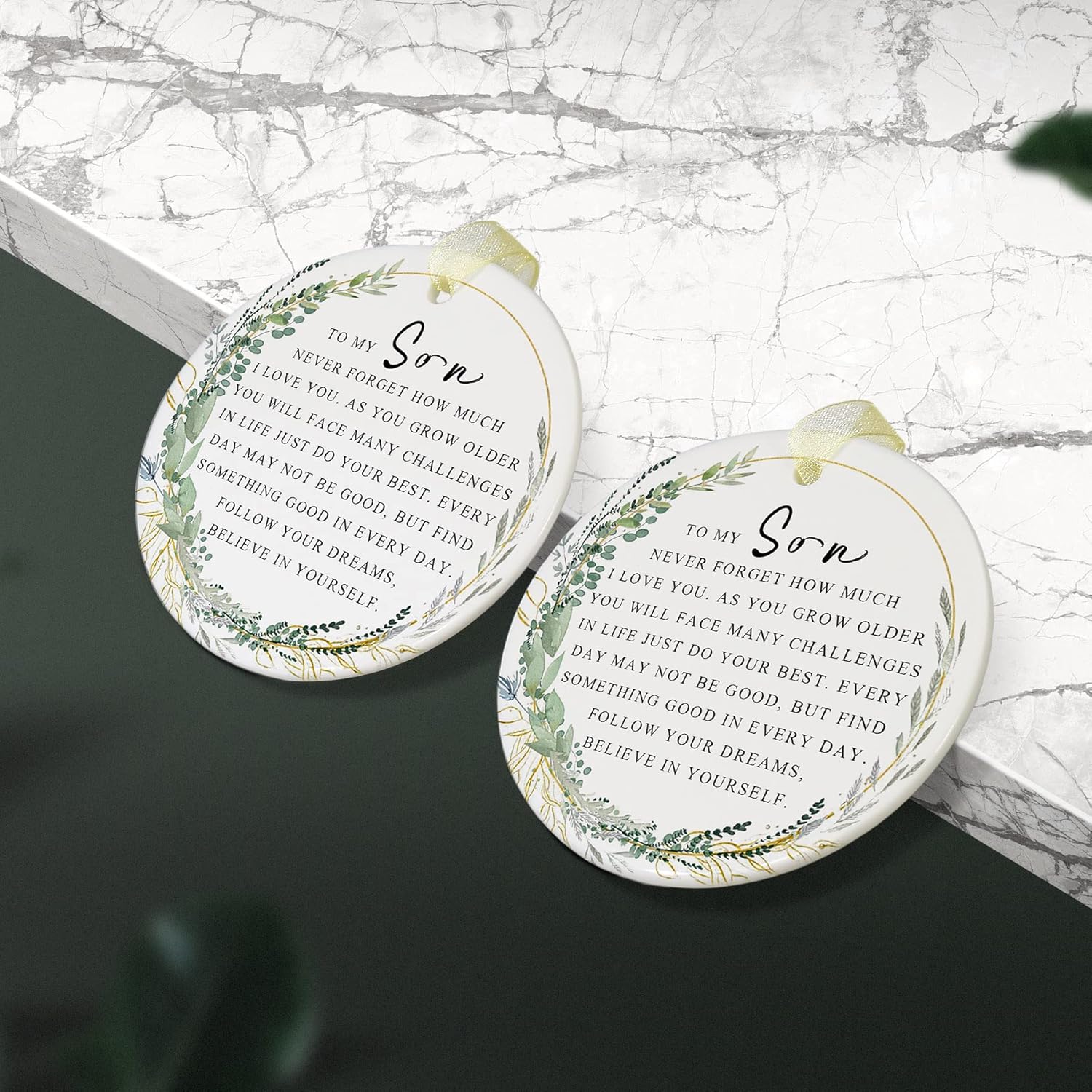 - đźăPerfect and delicate sizeăThis is a son memory ornament with a diameter of 2.9 inches and a thickness of only 0.18 inches. The product includes: a round son ornamentt*1, a gift box*1 and a lanyard*1. The gift box comes with it makes it easy for you to give the best son ever gifts directly to family and friends and other special people in your life, and the lanyard that comes with it helps to hang it easily on the Christmas tree or anywhere you want.