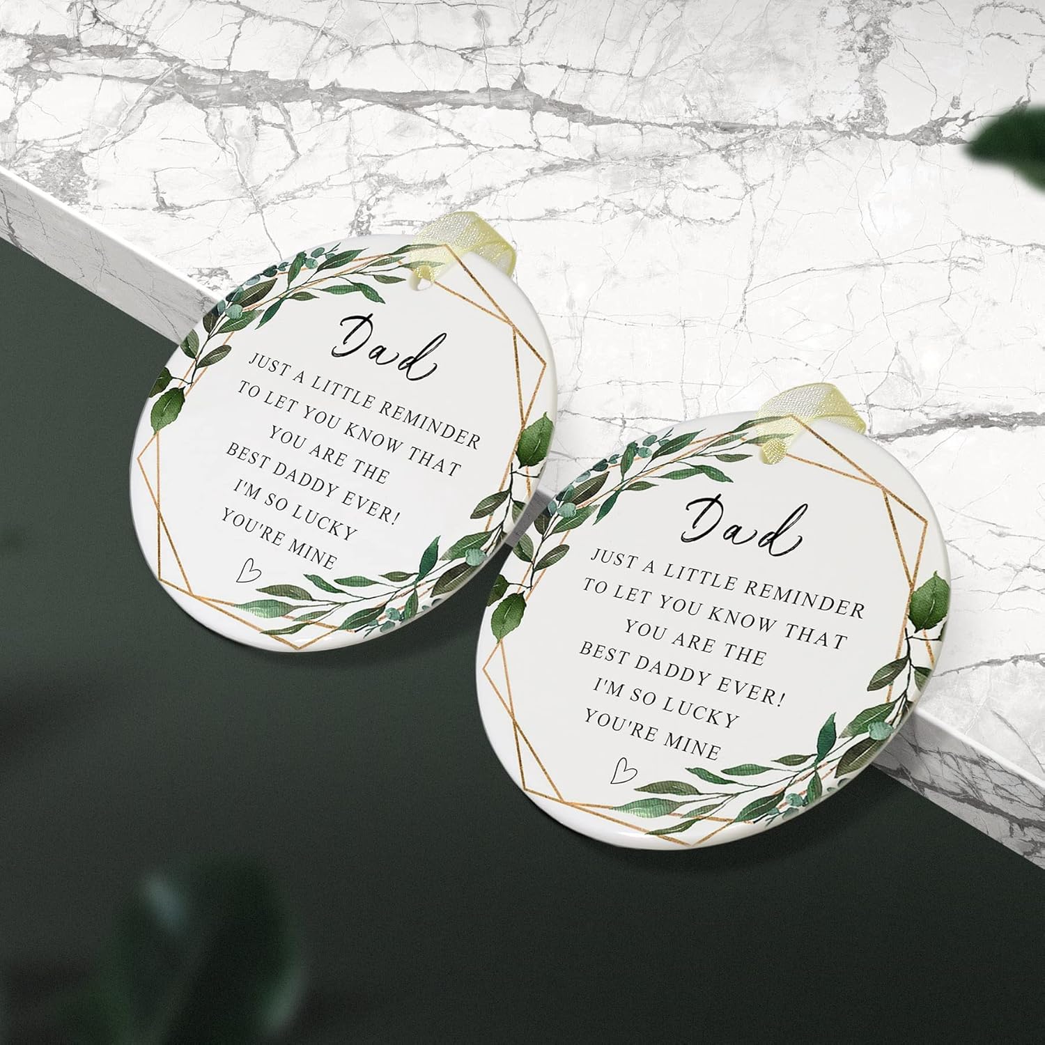 - 🌼【Perfect and delicate size】This is a father memory ornament with a diameter of 2.9 inches and a thickness of only 0.18 inches. The product includes: a round father ornamentt*1, a gift box*1 and a lanyard*1. The gift box comes with it makes it easy for you to give the best dad ever gifts directly to family and friends and other special people in your life, and the lanyard that comes with it helps to hang it easily on the Christmas tree or anywhere you want.