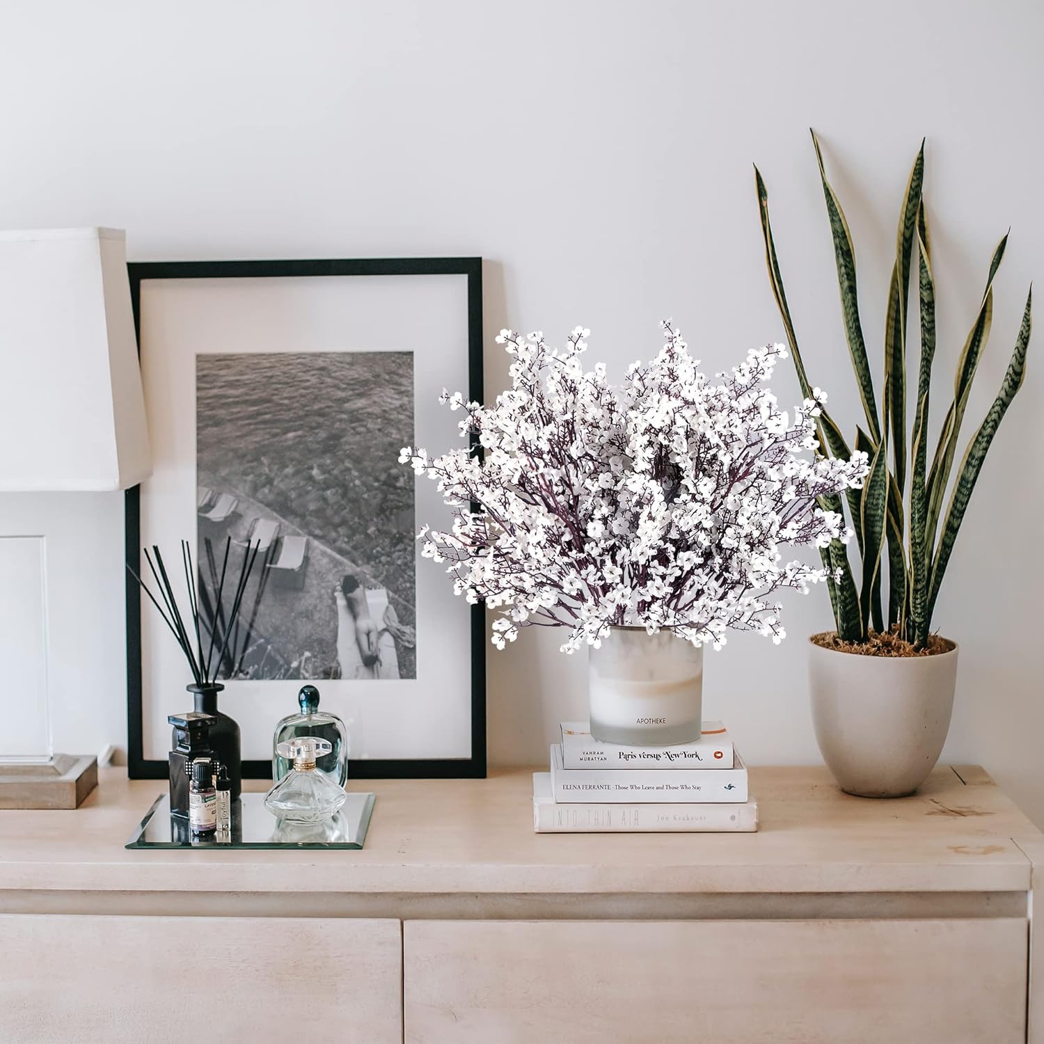 - PACKAGE & SIZE: The package has 15 white babys breath (no vase included) packed in a box, adequate enough to match many holiday ornaments and satisfy your diverse. The real touch fake silk flowers have a total length of 19in. Each piece has 5 item parts, allows you to decorate your space easily.