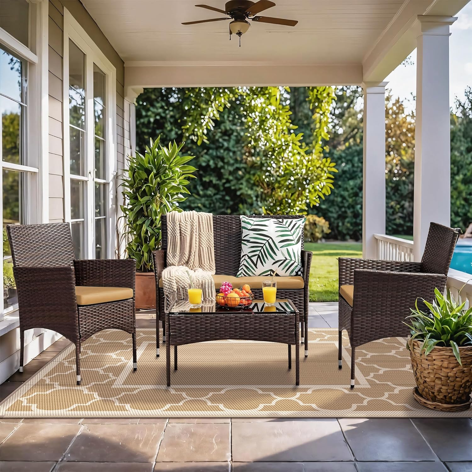 GENIMO 5' x 8' Outdoor Rug Waterproof for Patio Decor, Foldable Reversible Plastic Straw Area Rugs Mat for Camper, Outside Carpet for Rv, Deck, Porch, Picnic, Beach, Balcony, Brown & Beige