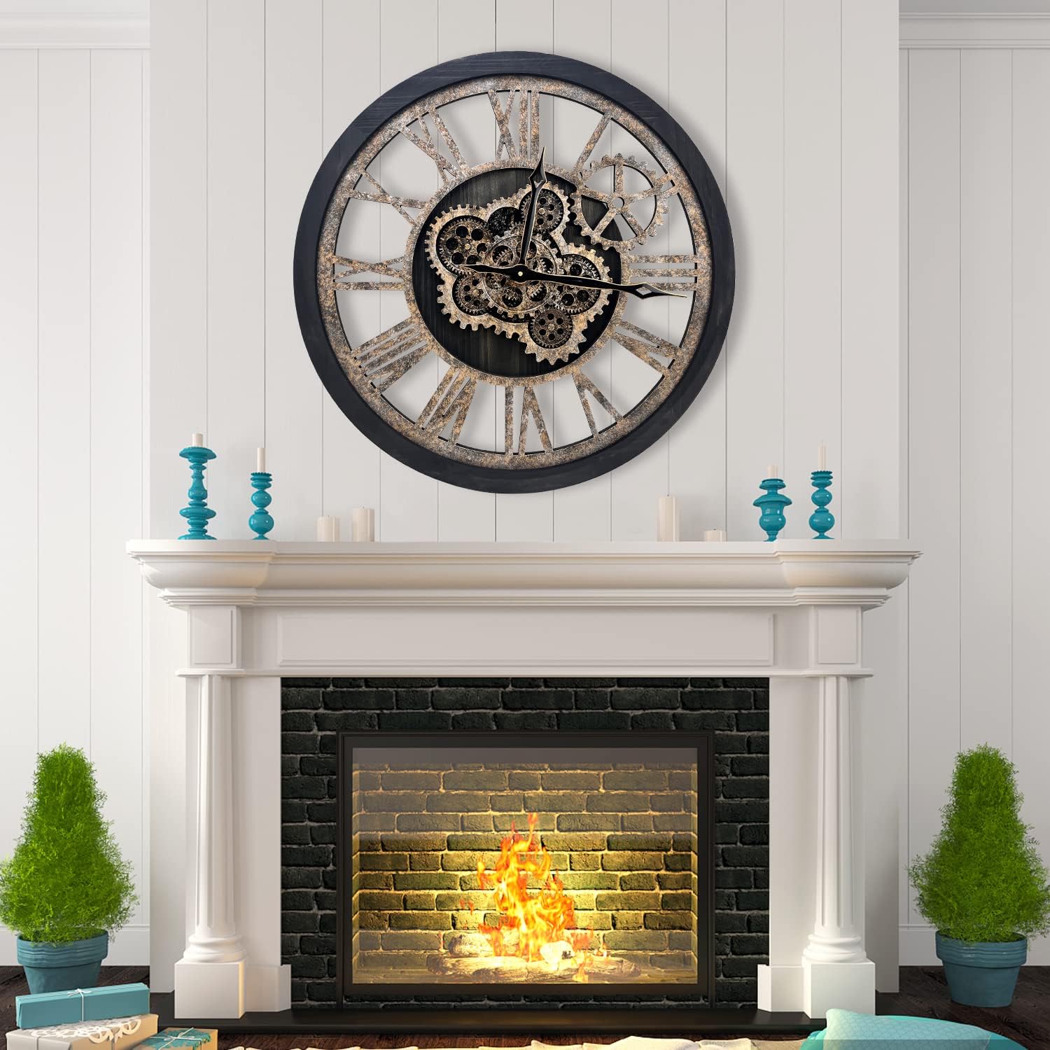 - WIDE APPLICATIONS: Oversized wall clock is not only a timepiece, but also a piece of artwork, greatly adding charm to a room, like living room, farmhouse, fireplace, bedroom or dining room, studio, gallery, loft, cafe, bar, club, etc. Rustic vintage wall clock will become an instant conversational piece for the moving gears and how cool it looks. Also awesome gifts for families or friends.