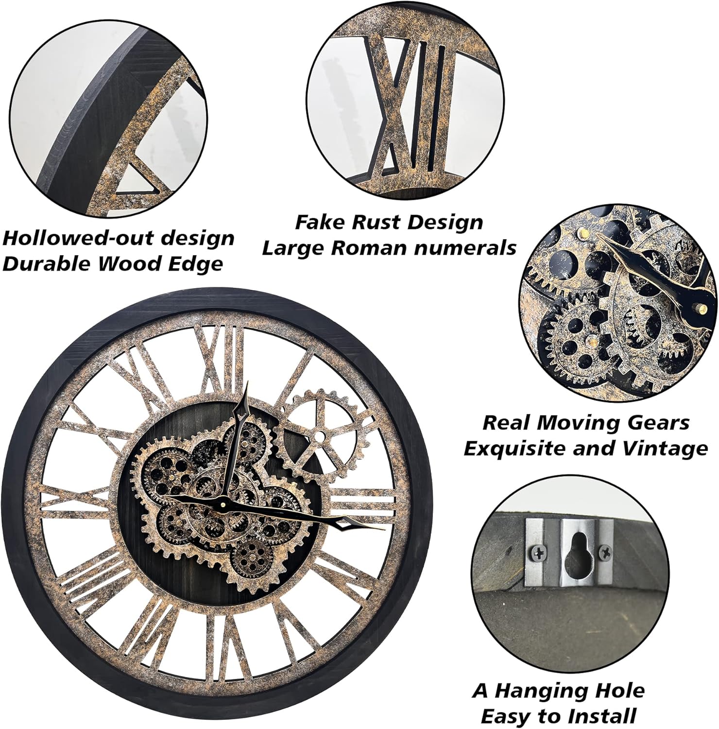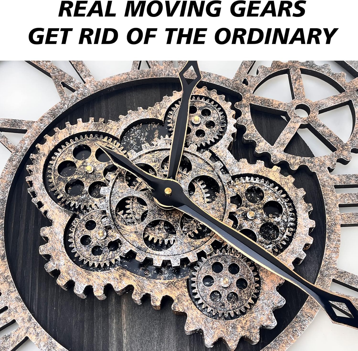 - REAL MOVING GEARS: Large wall clock with unique moving parts is as attractive as it is functional. Put batteries in, various gears start rotating fluently. Moving gear wall clock is amazing looking on the wall and will get so many compliments on it. Made from solid wood and painted by Rust-like color on wall clock create a very rustic and industrial atmosphere. Large farmhouse wall clock is professionally handmade and pursuit of naturalness, so it may have some little imperfections.